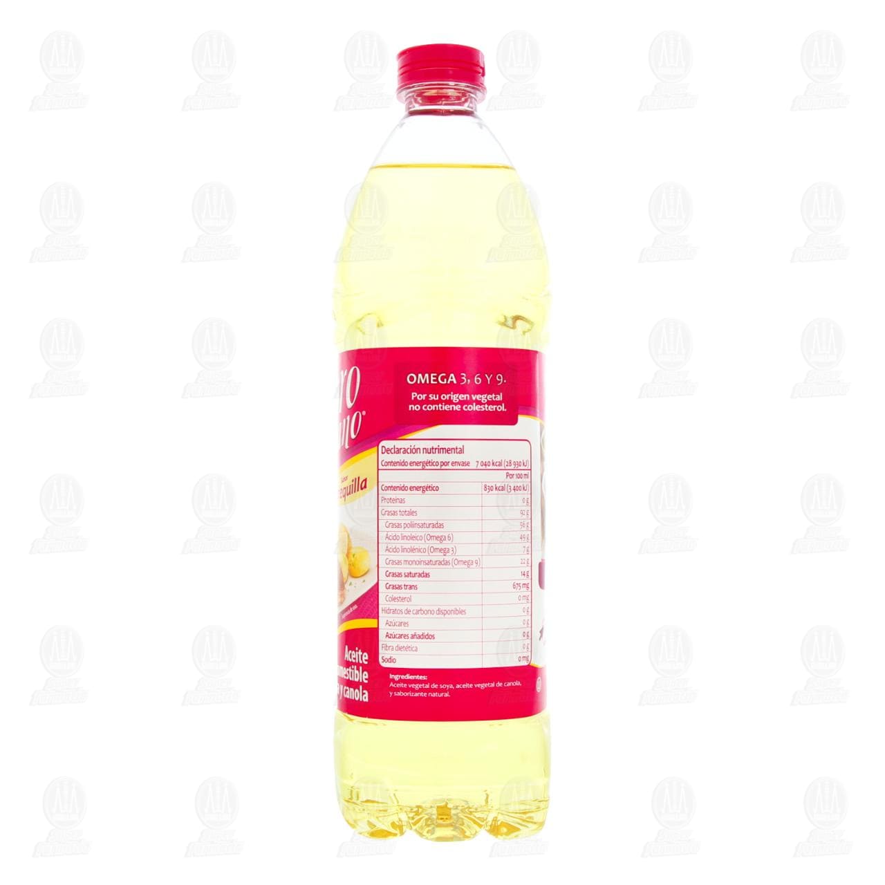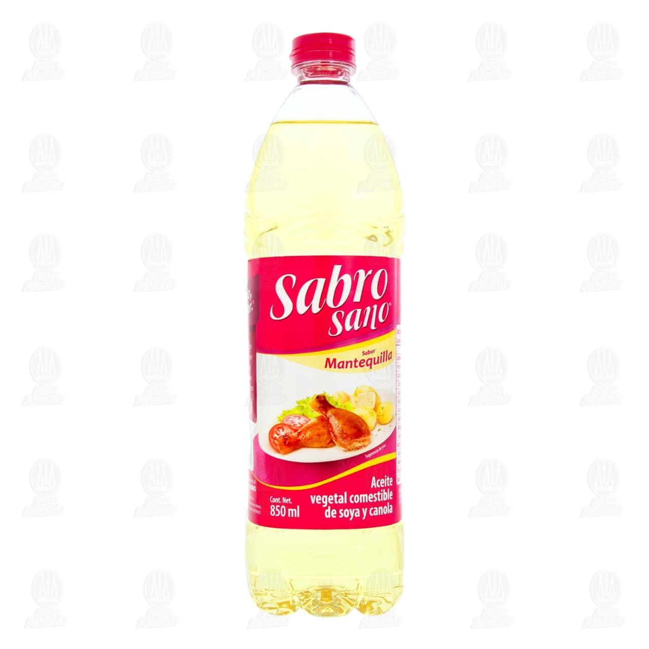 Aceite comestible Sabrosano de soya y canola, sin colesterol gracias a su origen vegetal, contiene omega 3, 6 y 9. Botella con 850 mililitros.