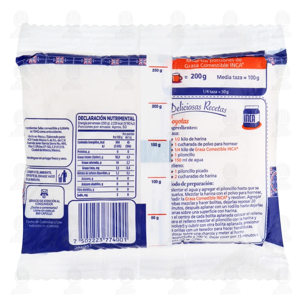Manteca vegetal Inca, grasa comestible. Bolsa con 250 gramos.