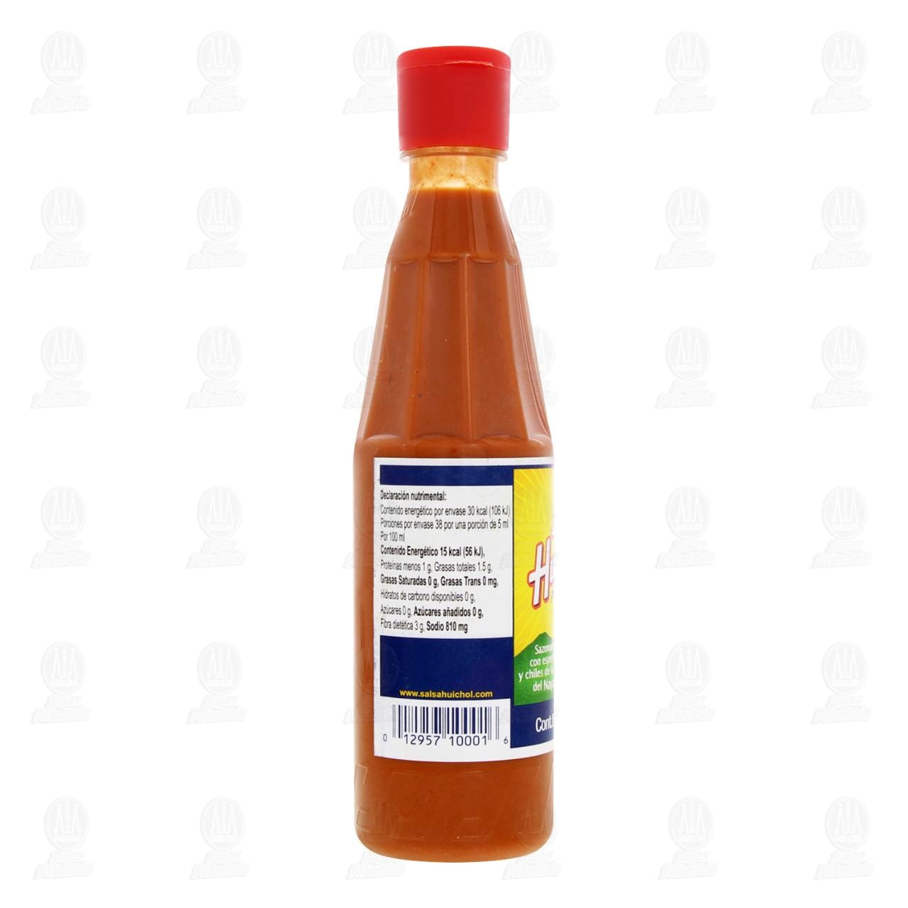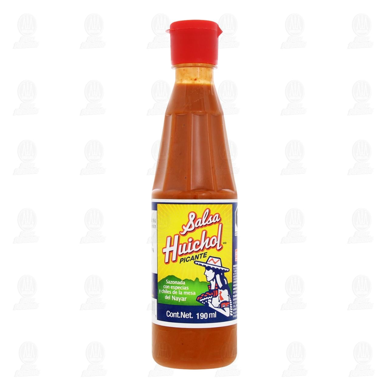 Salsa picante Huichol, sazonada con especias y chiles de la mesa del Nayar. Botella con 190 mililitros.