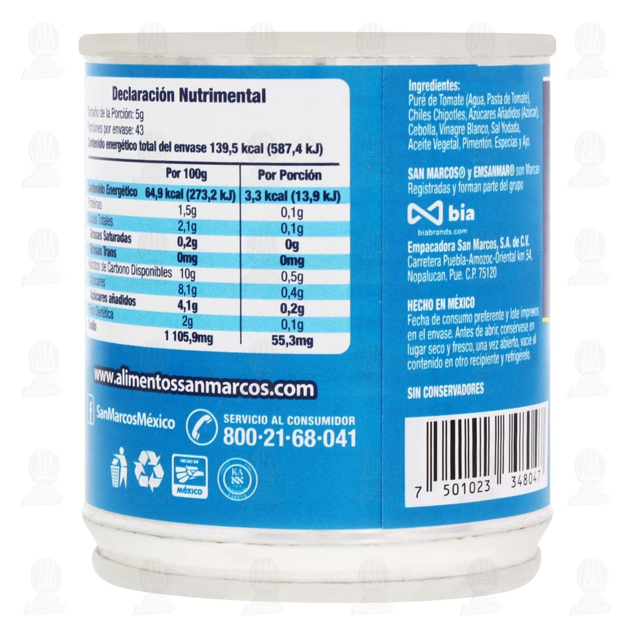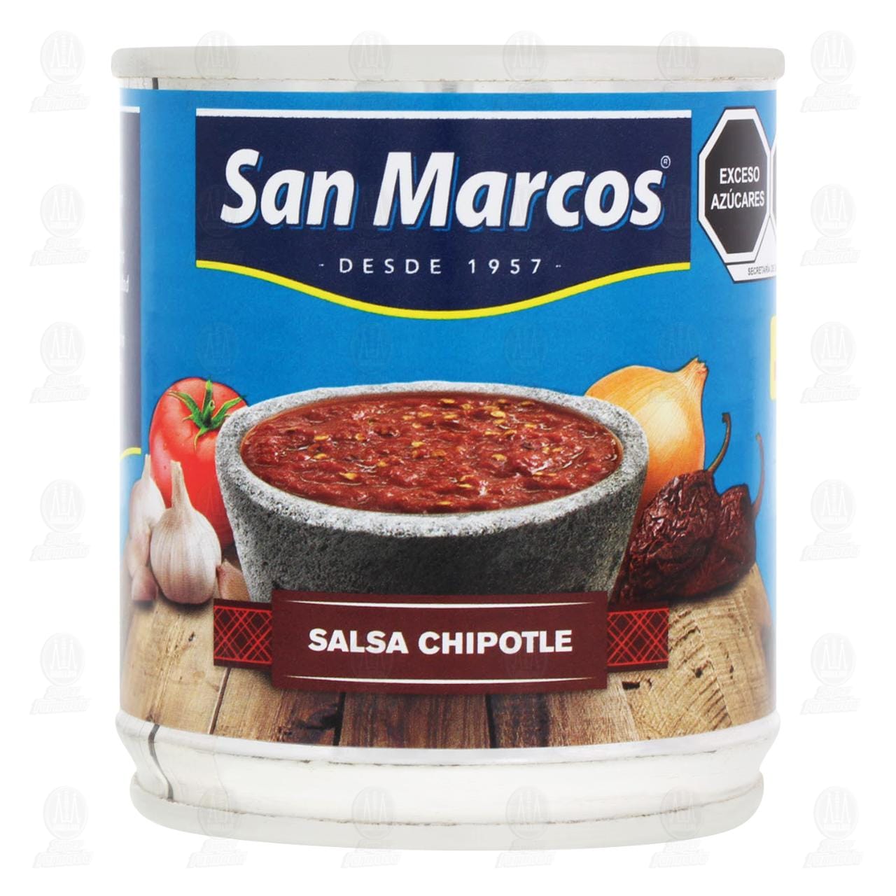 Salsa San Marcos Chipotle, elaborada con ingredientes frescos. Lata con 215 gramos.