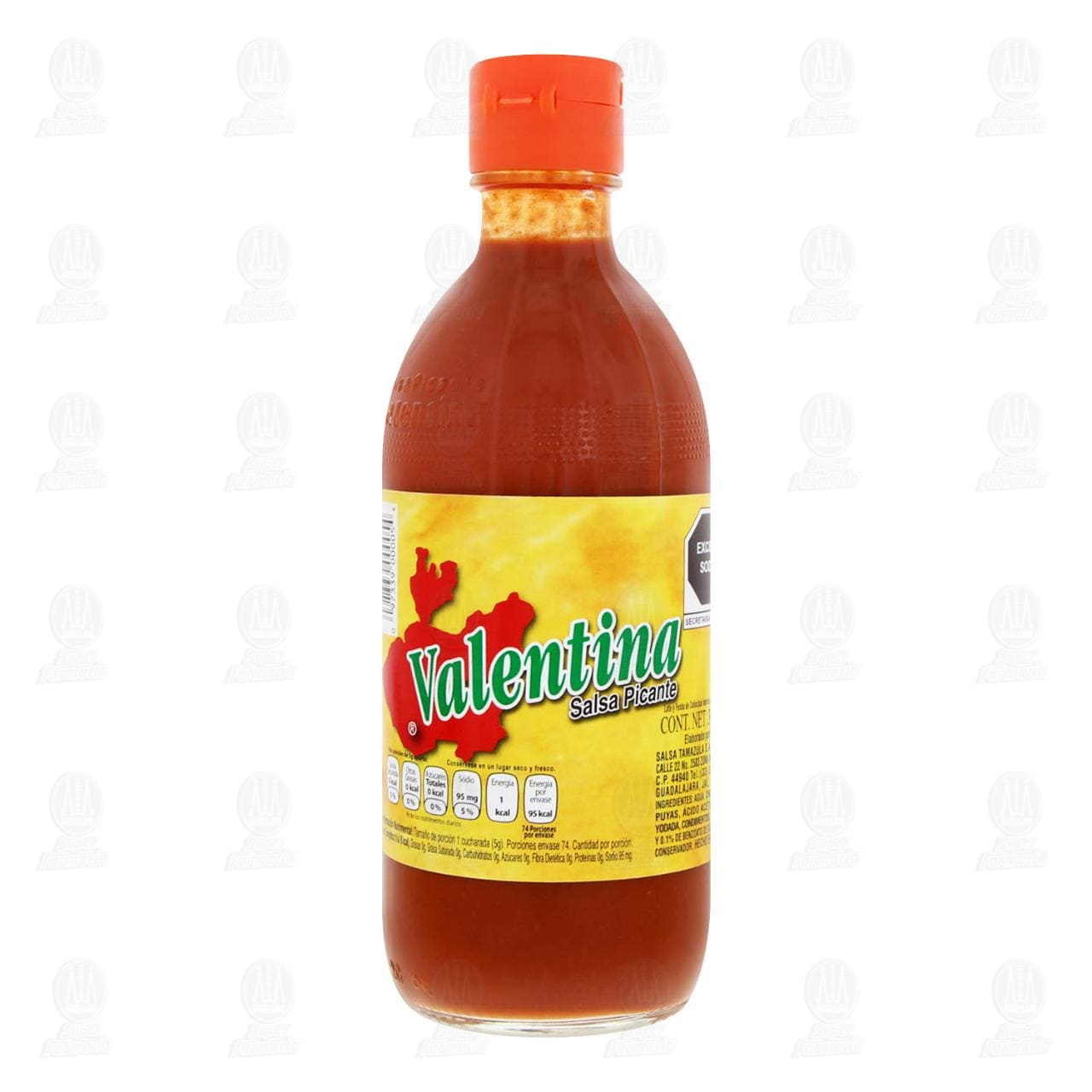 Salsa Valentina picante, etiqueta amarilla. Botella con 370 mililitros.