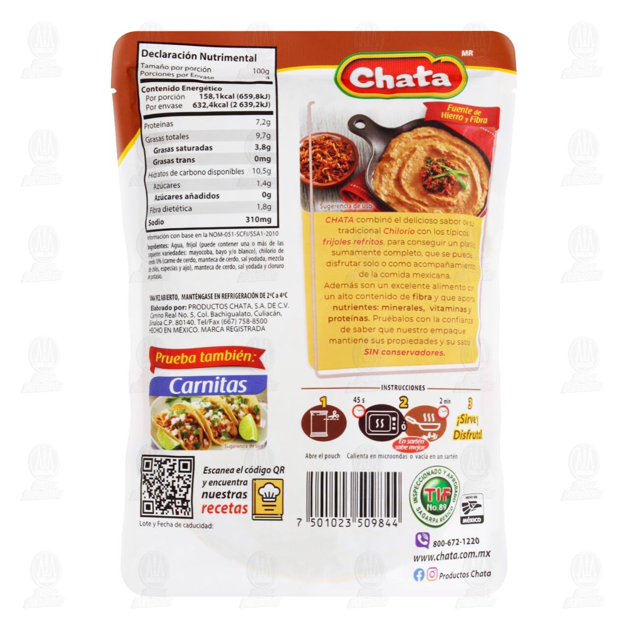 Frijoles Chata refritos con chilorio, cero conservadores. Sobre con 430 gramos.