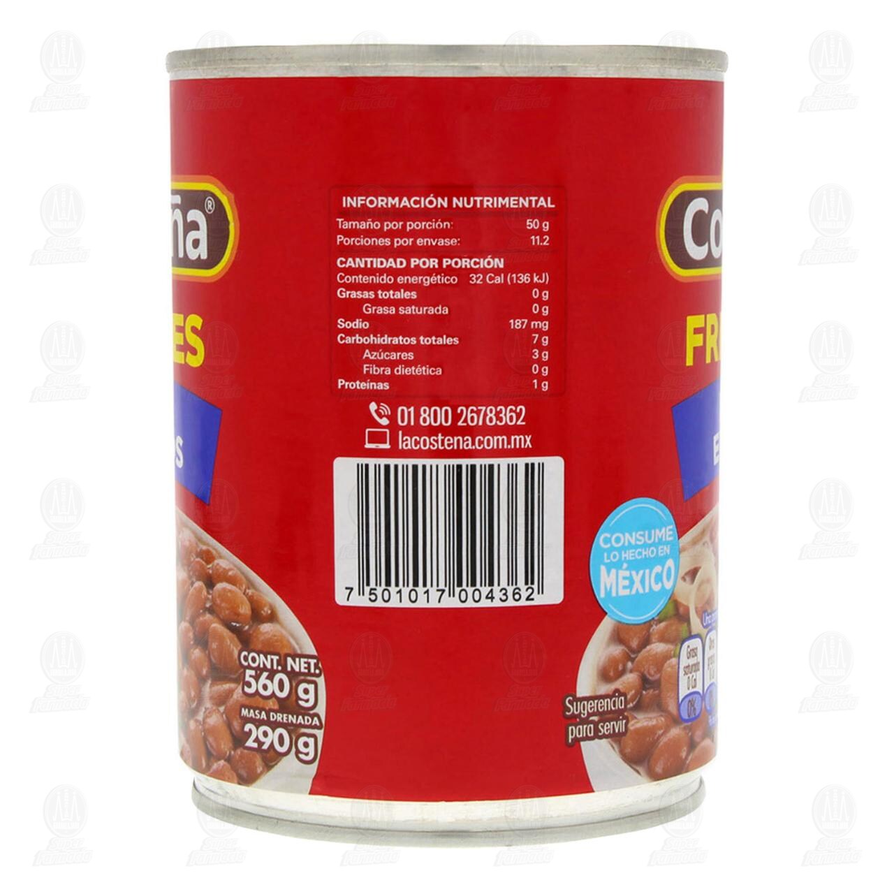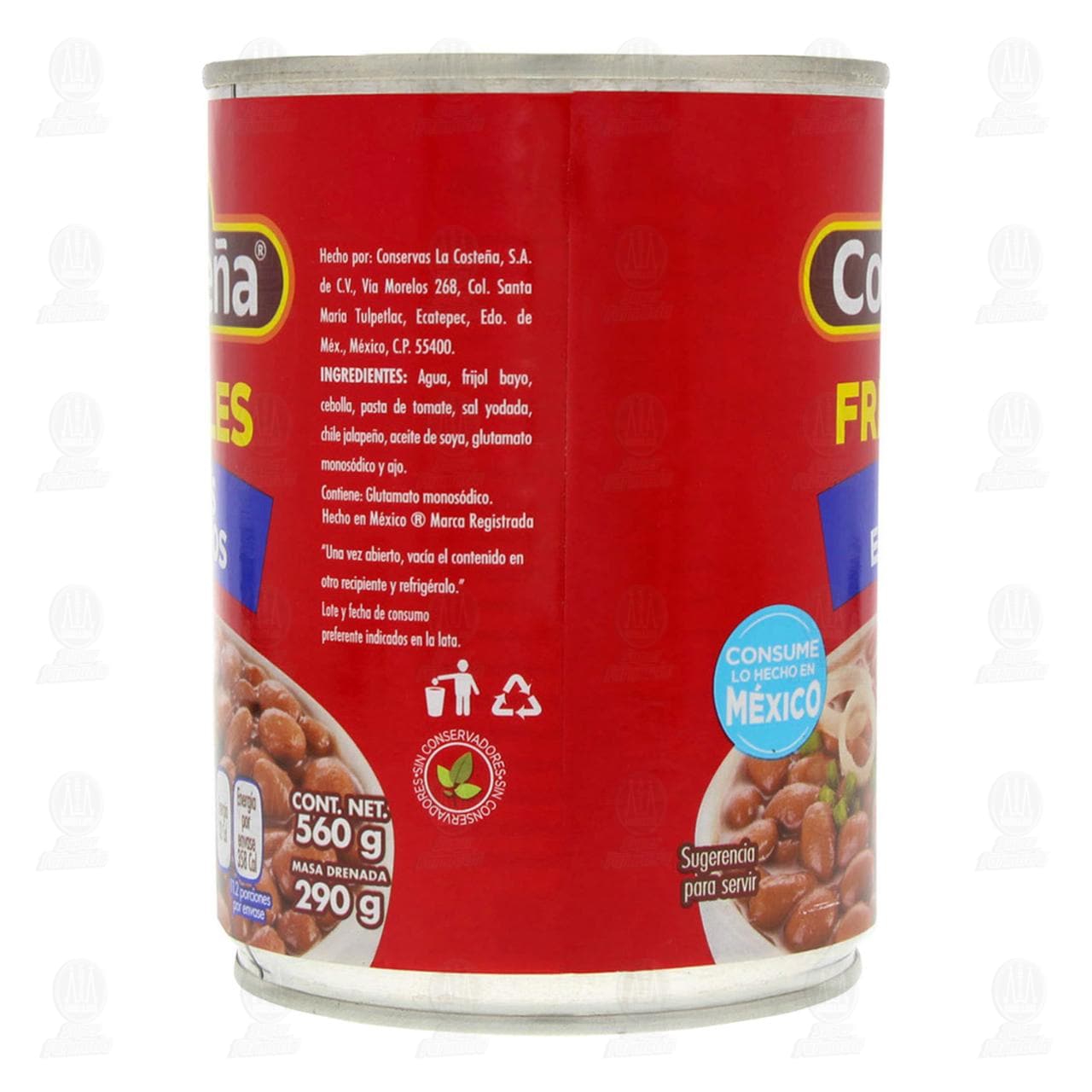 Frijoles bayos enteros La Costeña, sin conservadores. Lata con 560 gramos/290 gramos de masa drenada.