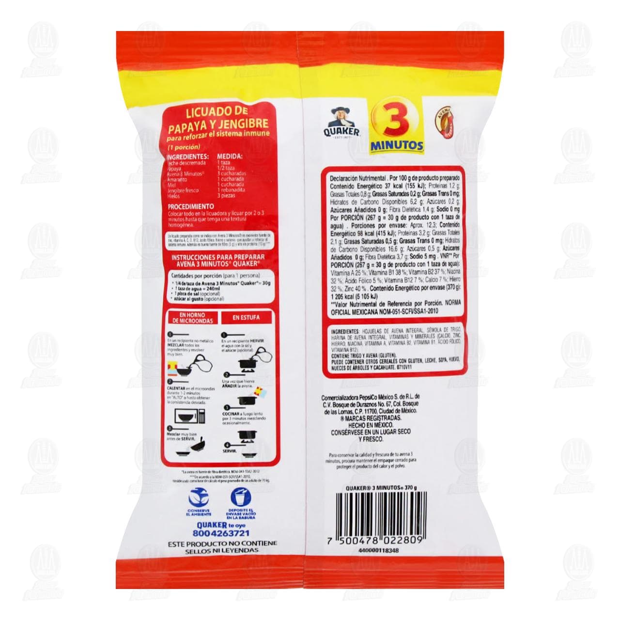Avena Quaker 3 Minutos con sémola de trigo, fortificada con 9 vitaminas y minerales. Bolsa con 370 gramos.