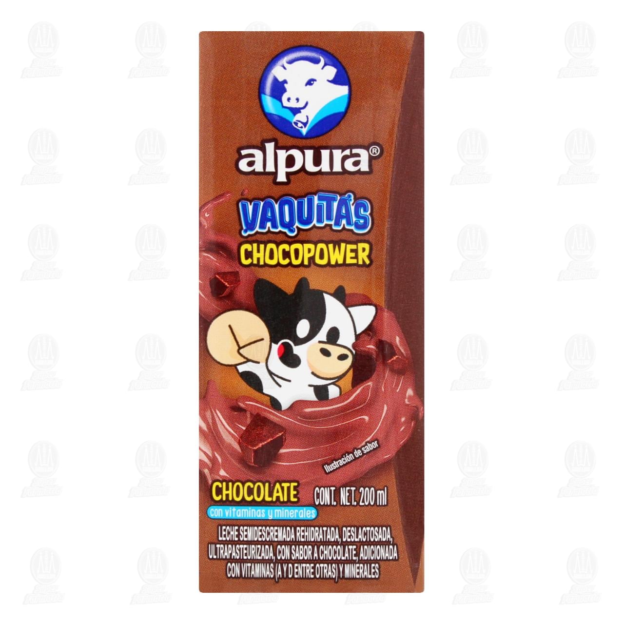 Leche Alpura Vaquitas Chocopower semidescremada rehidratada, deslactosada, ultrapasteurizada con sabor a chocolate, adicionada con vitaminas A y D y minerales. Envase con 200 ml.