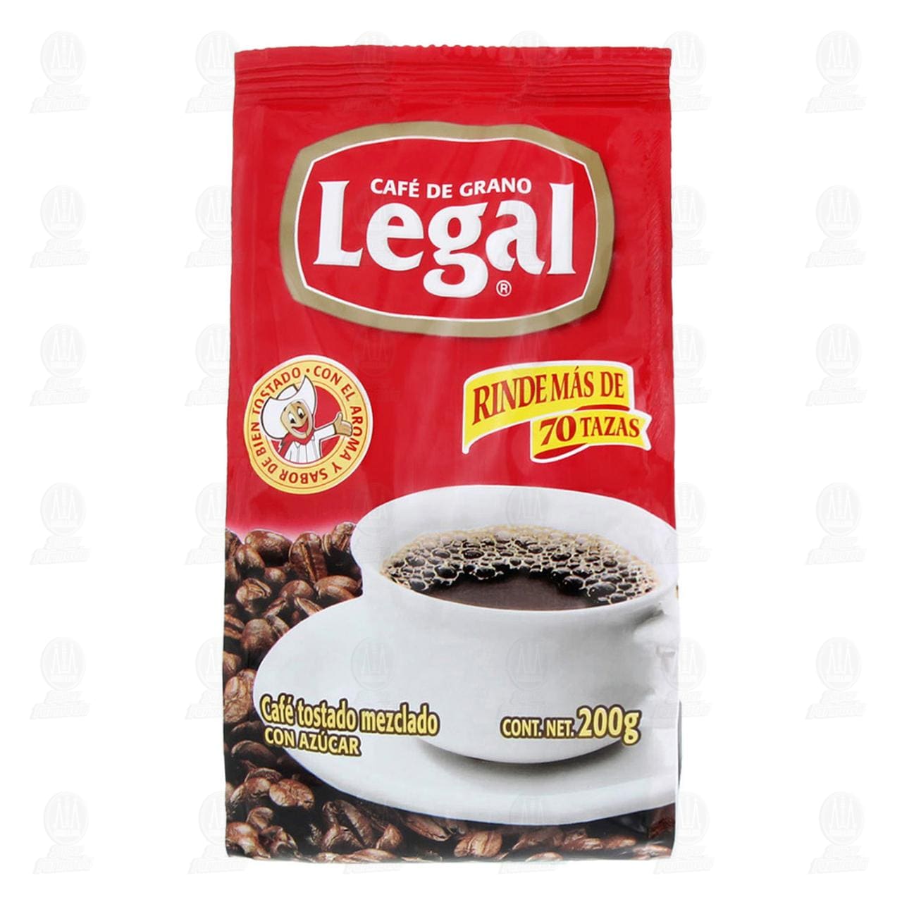 Café de grano Legal tostado con azúcar, aroma y sabor bien tostado. Bolsa con 200 gramos. Rinde más de 70 tazas.