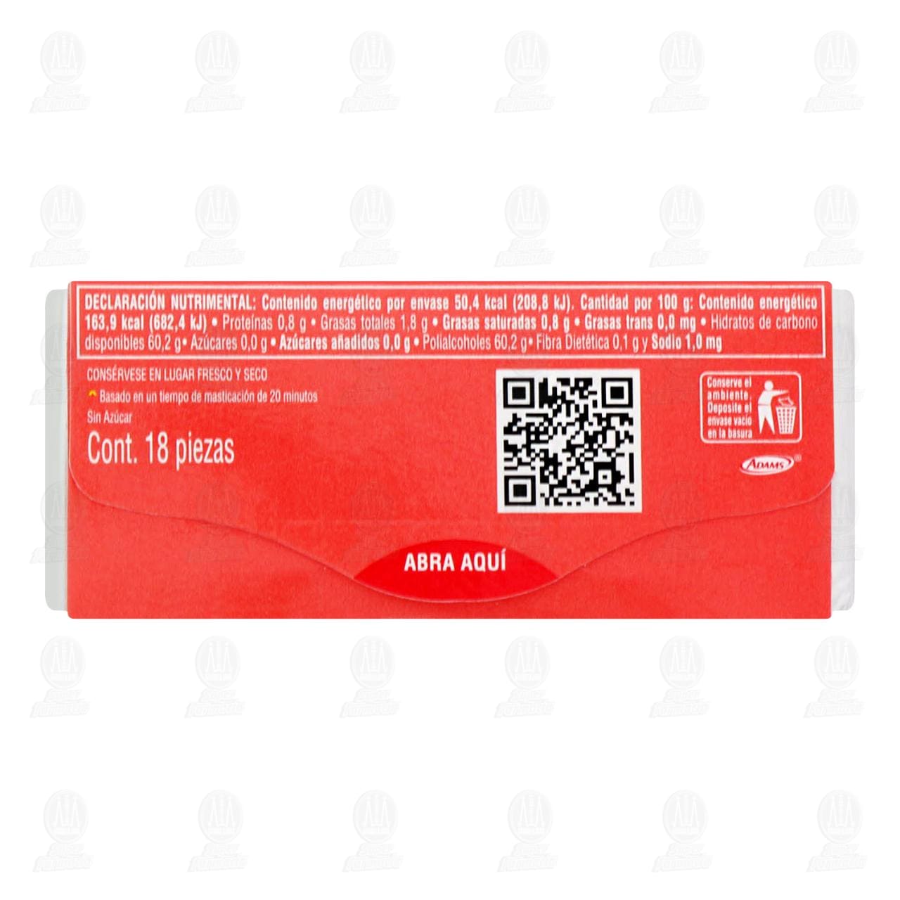 Chicles Trident, goma de mascar sin azúcar sabor a sandía. Paquete de 30.6 gramos con 18 piezas.