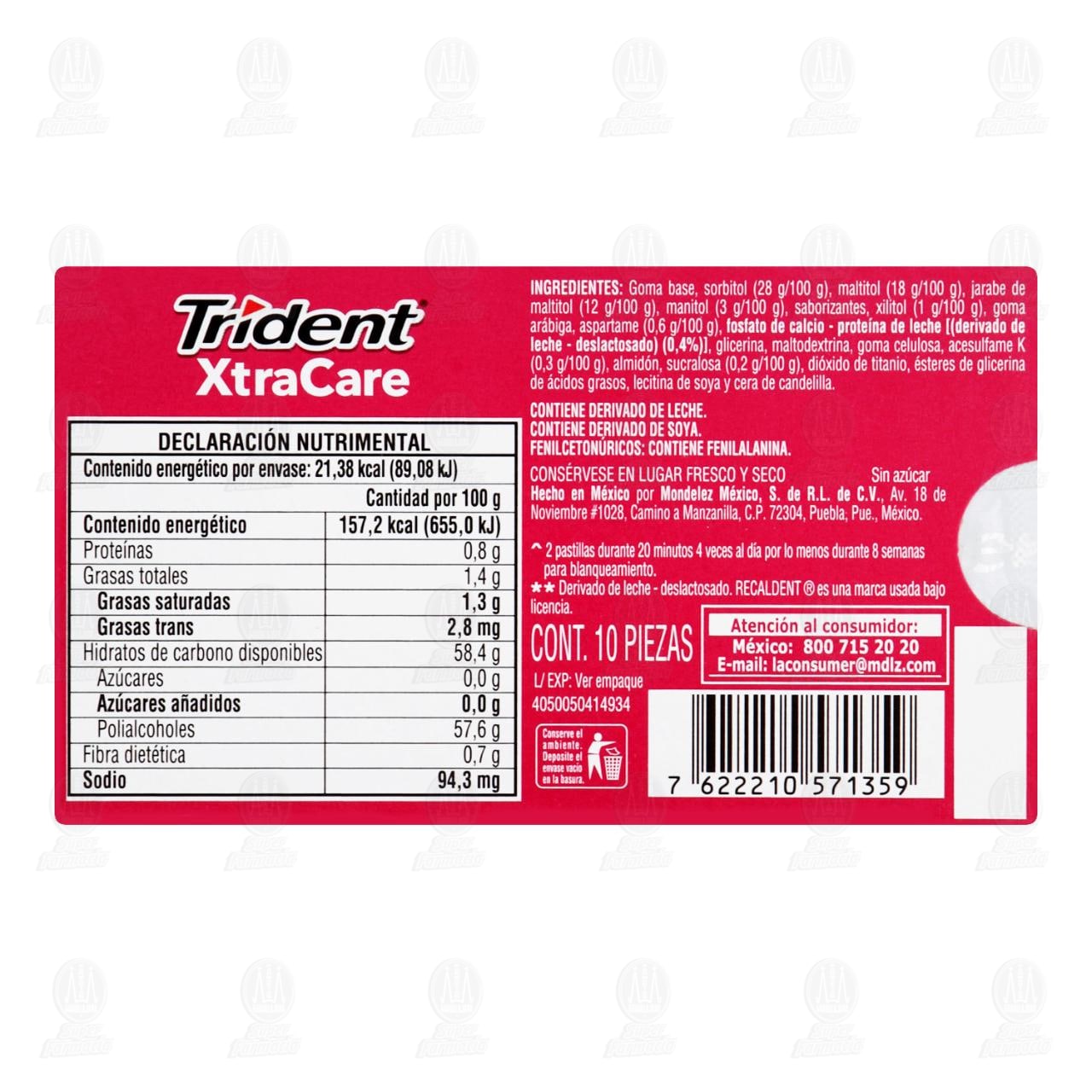 Goma de Mascar Trident Xtra Care Cool Bubble sin azúcar Sabor a Frutas. Paquete con 13.6 gramos con 10 piezas.