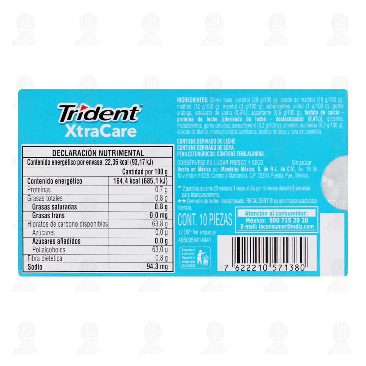 Goma de Mascar Trident Xtra Care Freshmint sin azúcar sabor Menta Fresca. Paquete de 13.6 gamos con 10 piezas.
