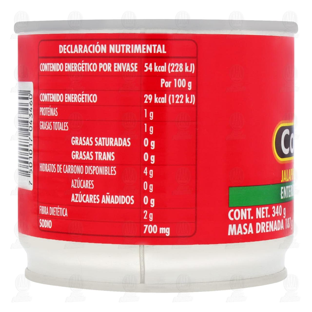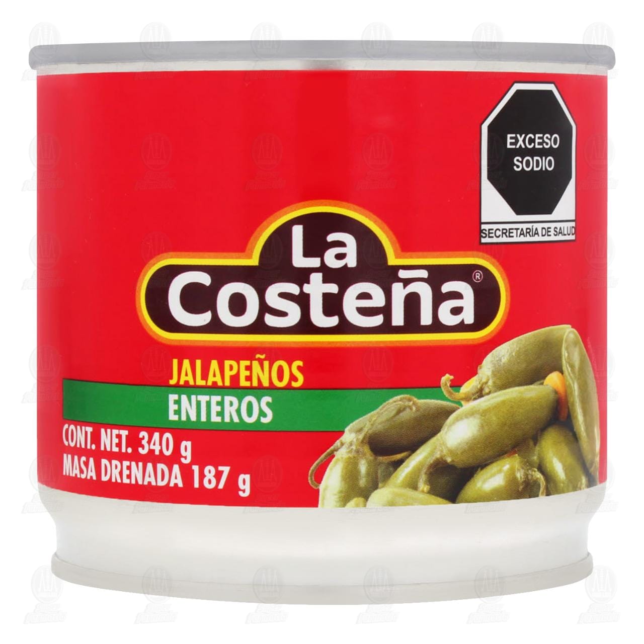 Alimento enlatado La Costeña, chiles jalapeños enteros, sin conservadores. Lata con 340 gramos, masa drenada 187 gramos.