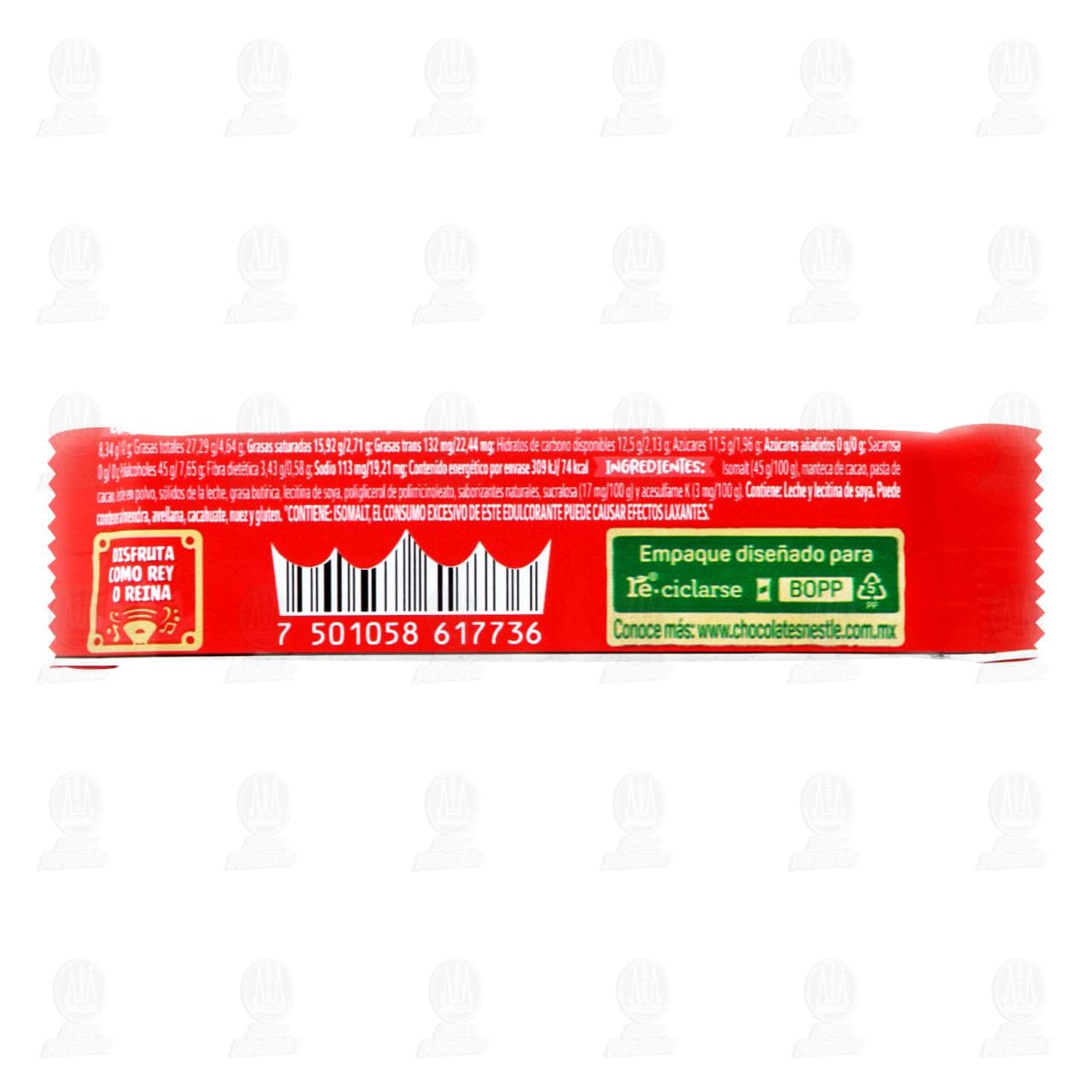 Chocolate Nestlé Carlos V con leche, sin azúcar añadida. Contiene 17 gramos.