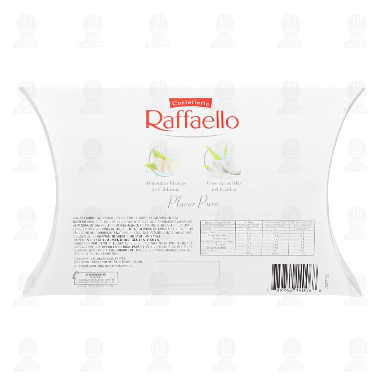 Contiene leche, almendras, gluten y soya. Conservar en lugar fresco y seco. No exponer directamente a los rayos del sol. Exceso de calorías. Exceso de azúcares. Exceso de grasas saturadas.Detalles del producto