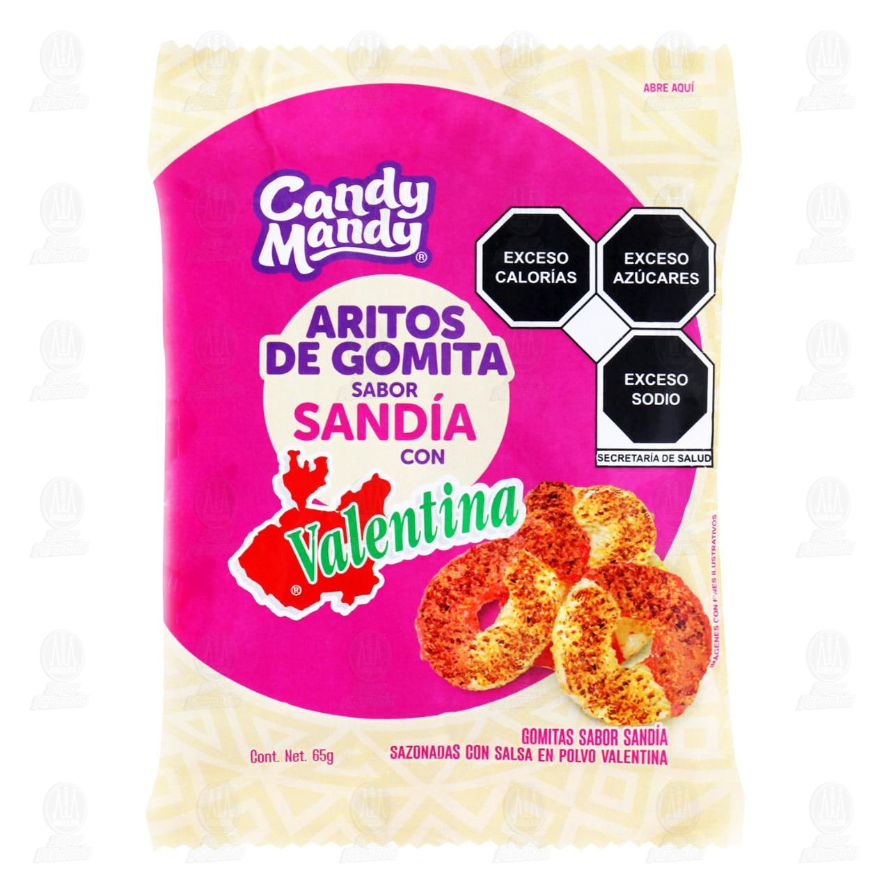 Aritos de Gomita Candy Mandy sabor sandía sazonadas con salsa en polvo valentina. Bolsa con 65 gramos.