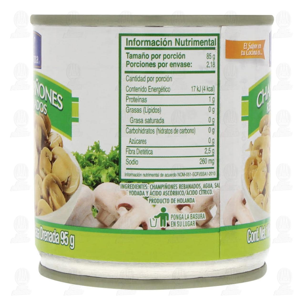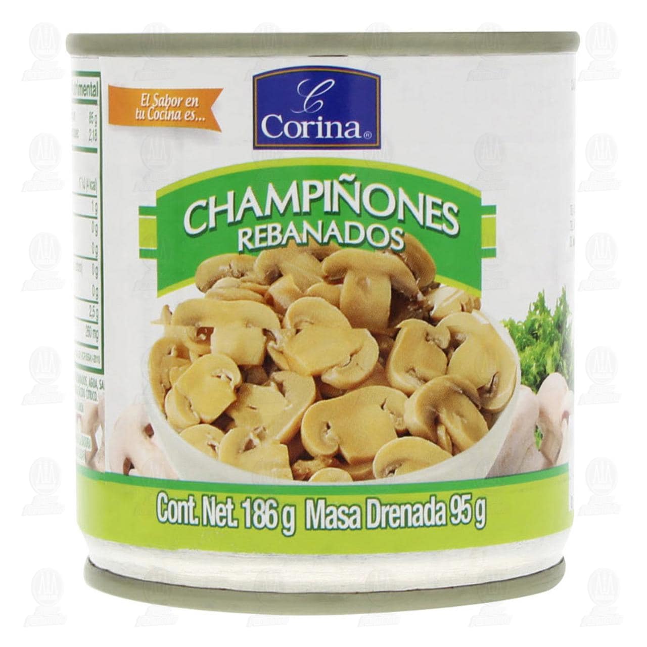 Alimento enlatado Corina, champiñones rebanados. Lata con 186 gramos, masa drenada 95 gramos.