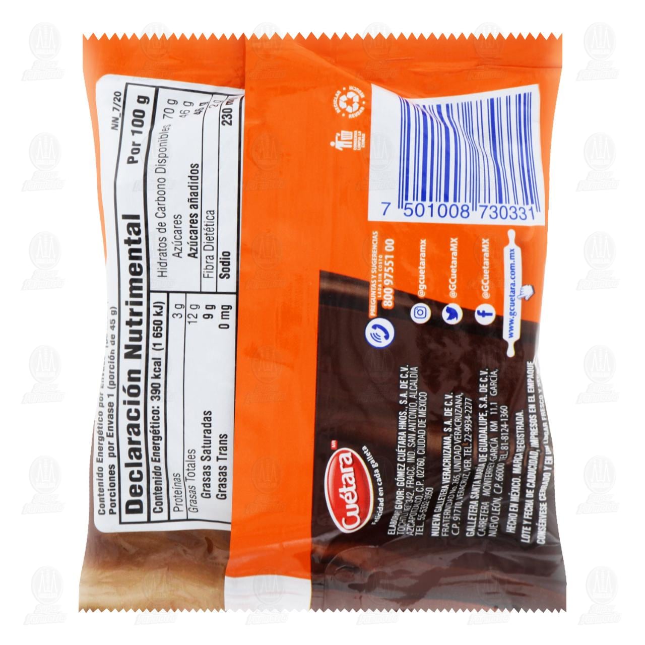 Galleta Cuétara Hojaldradas, tipo sándwich sabor cajeta y cubierta sabor chocolate. Paquete con 45 gramos.