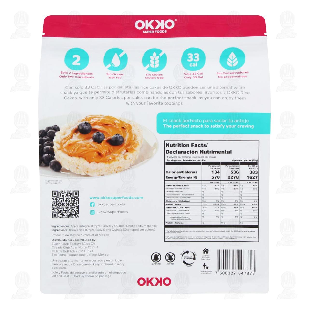 Galletas de arroz Okko Super Foods Rice Cakes con quinoa, pueden ser una alternativa de snack ya que te permite disfrutarlas combinándolas con tus sabores favoritos. Paquete de 140 gramos con 16 piezas.