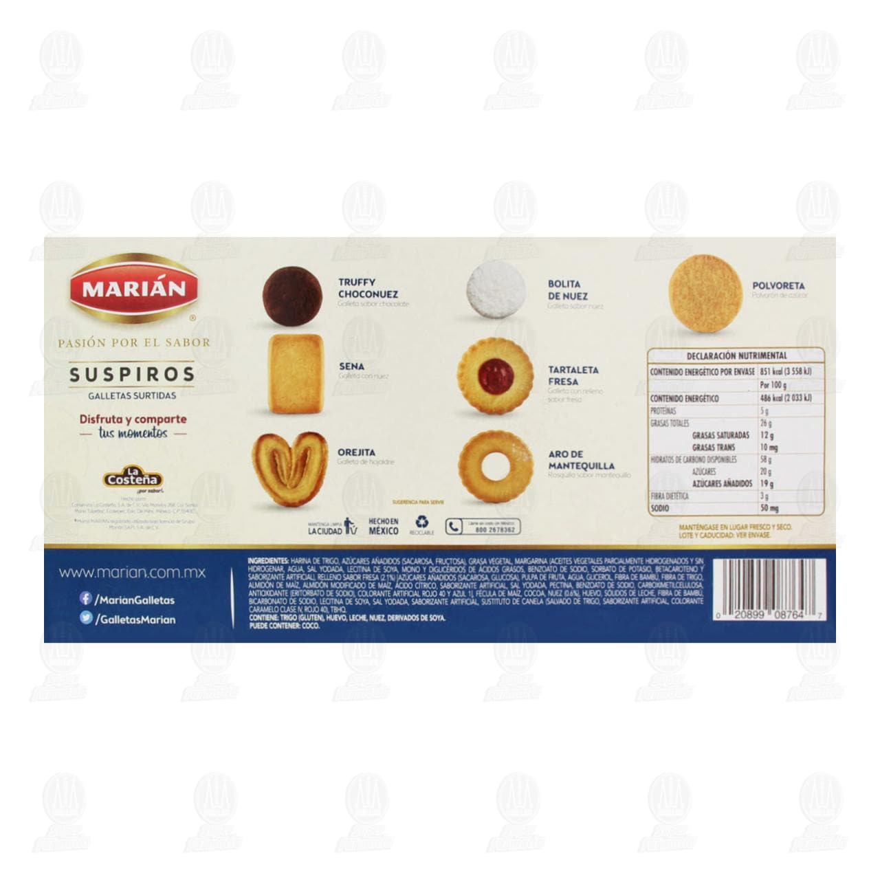 Galletas Marián Suspiros surtidas, con 7 variedades de galletas (Truffy Choconuez, Sena, Orejita, Bolita de Nuez, Tartaleta Fresa, Aro de Mantequilla, Polvoreta). Caja con 175 gramos.