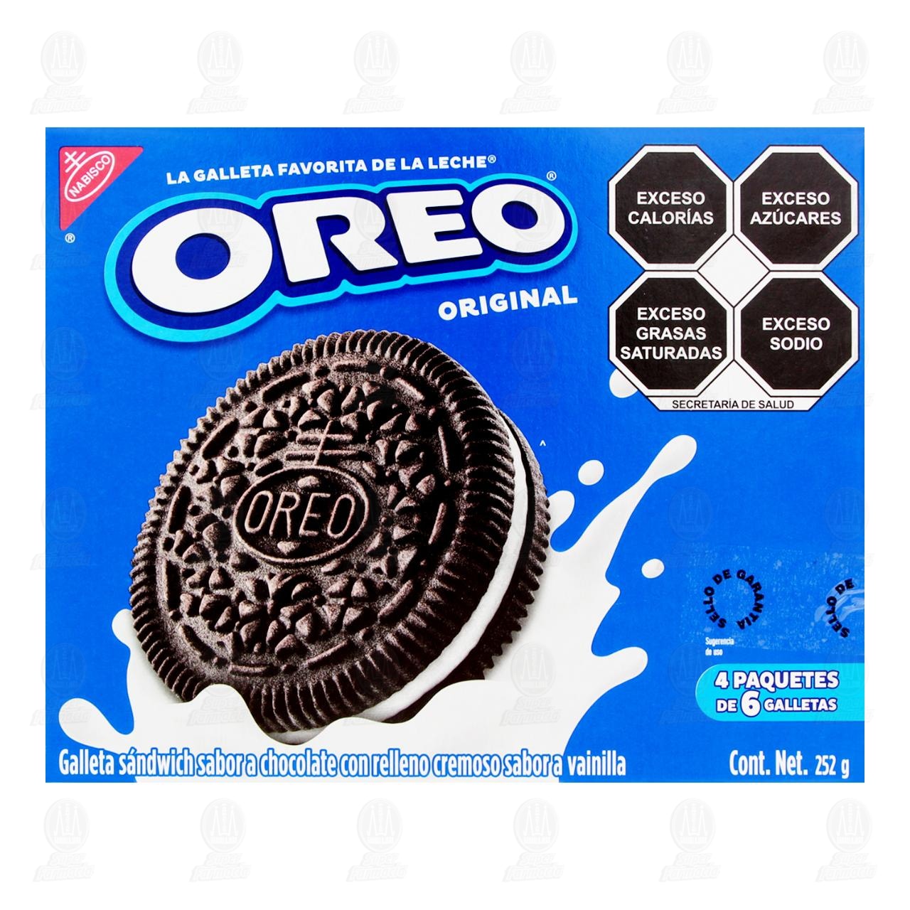 Galletas Oreo Original tipo sándwich sabor a chocolate con relleno cremoso sabor a vainilla. Caja con 4 paquetes de 6 galletas.