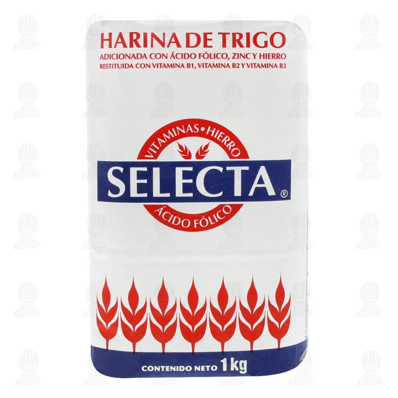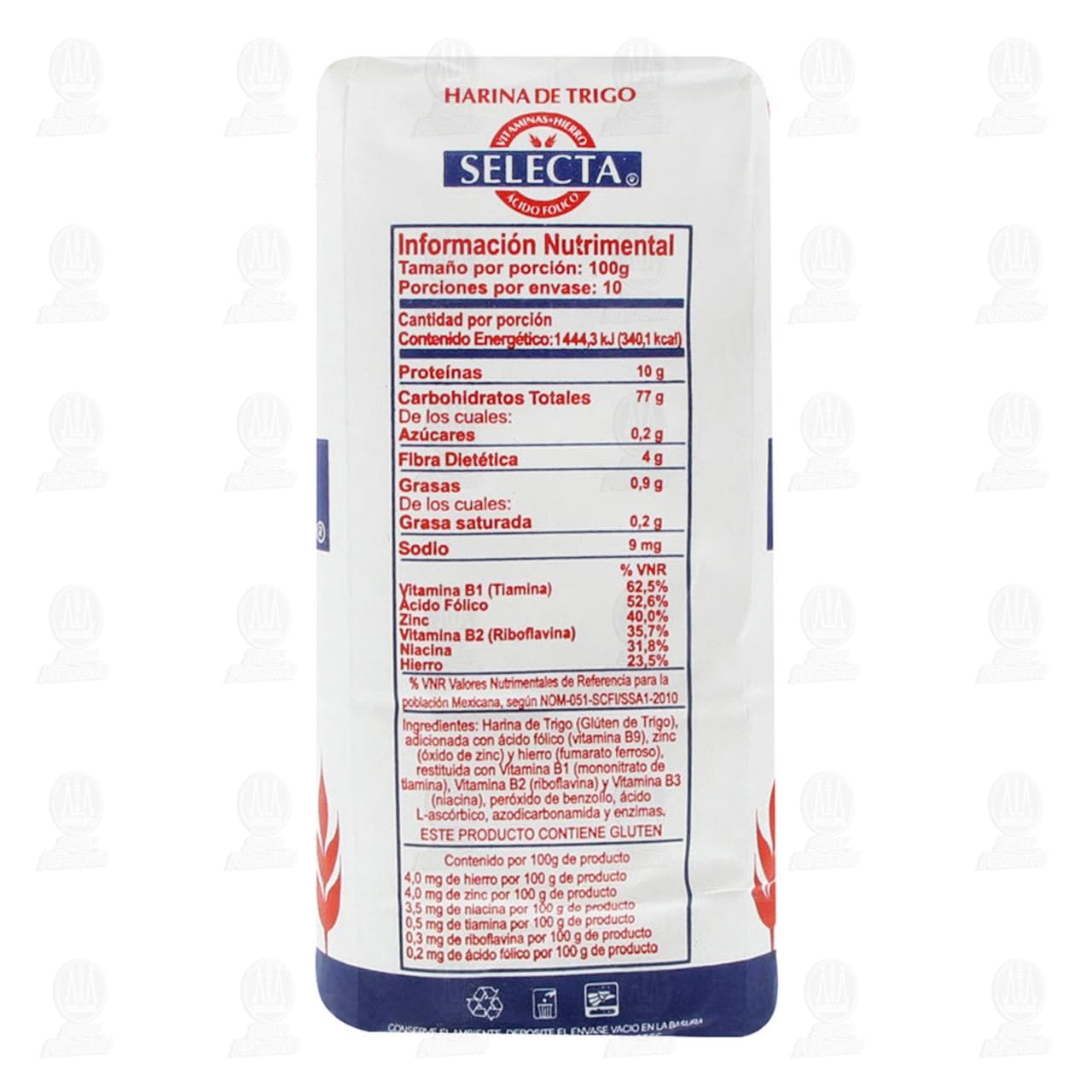 Harina de trigo Selecta, adicionada con ácido fólico, zinc y hierro restituida con vitamina B1, vitamina B2 y vitamina B3. Bolsa con 1 kilogramo.