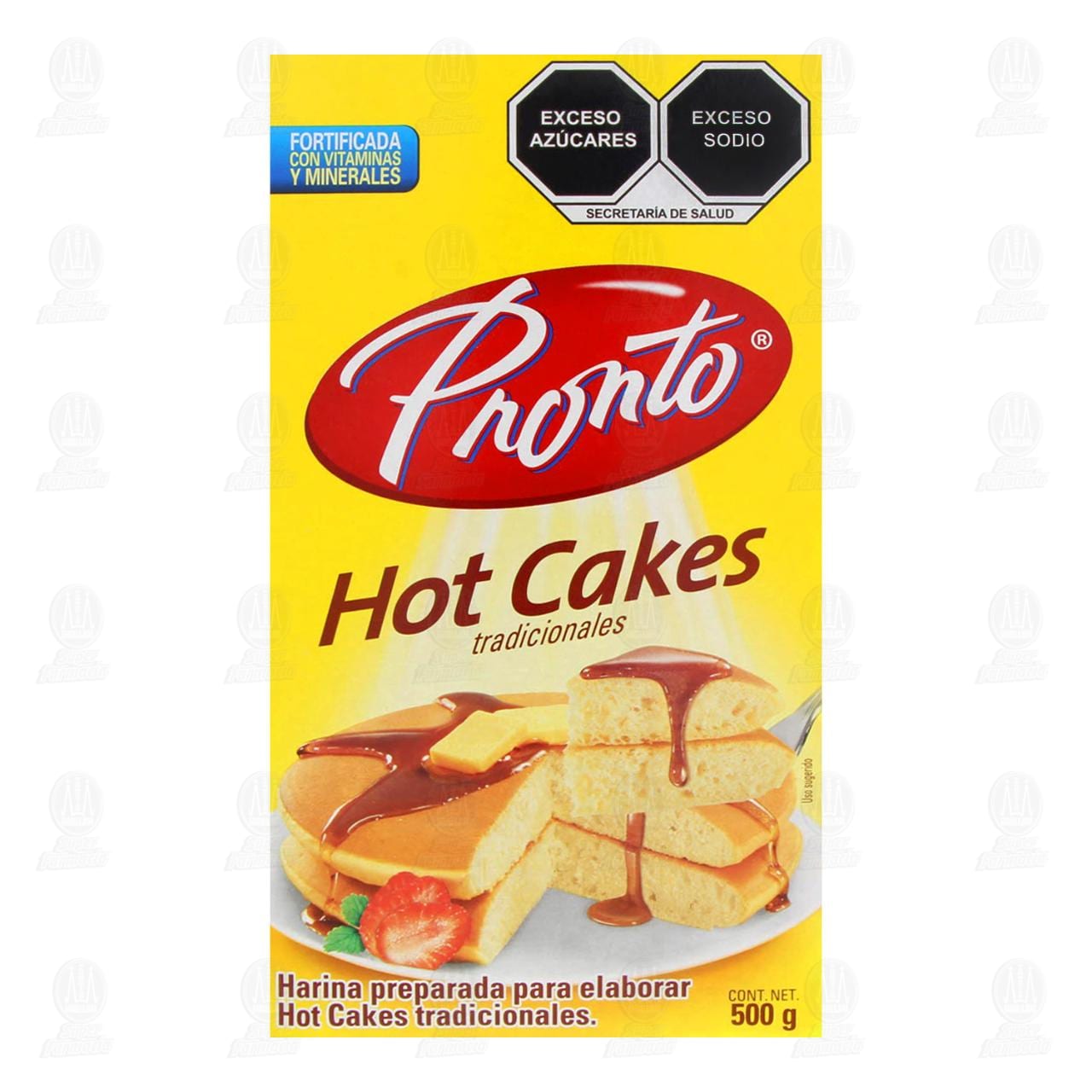 Harina preparada Pronto, para elaborar Hot Cakes tradicionales, fortificada con vitaminas y minerales. Caja con 500 gramos.