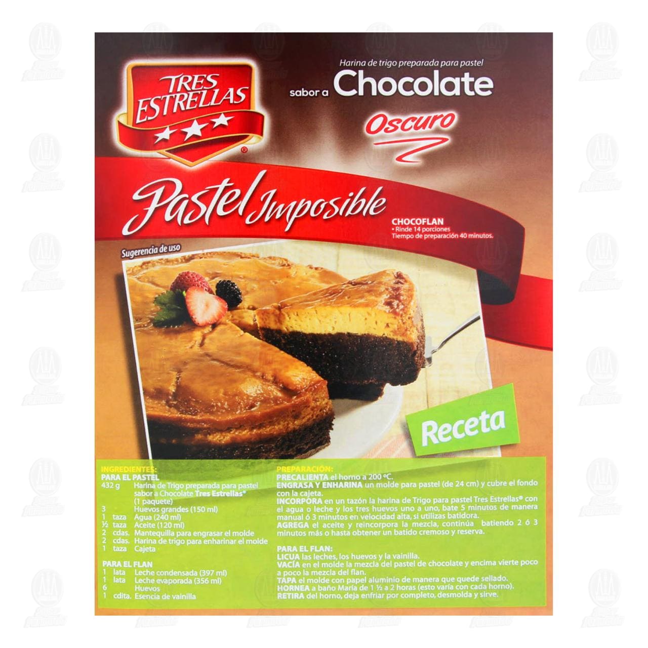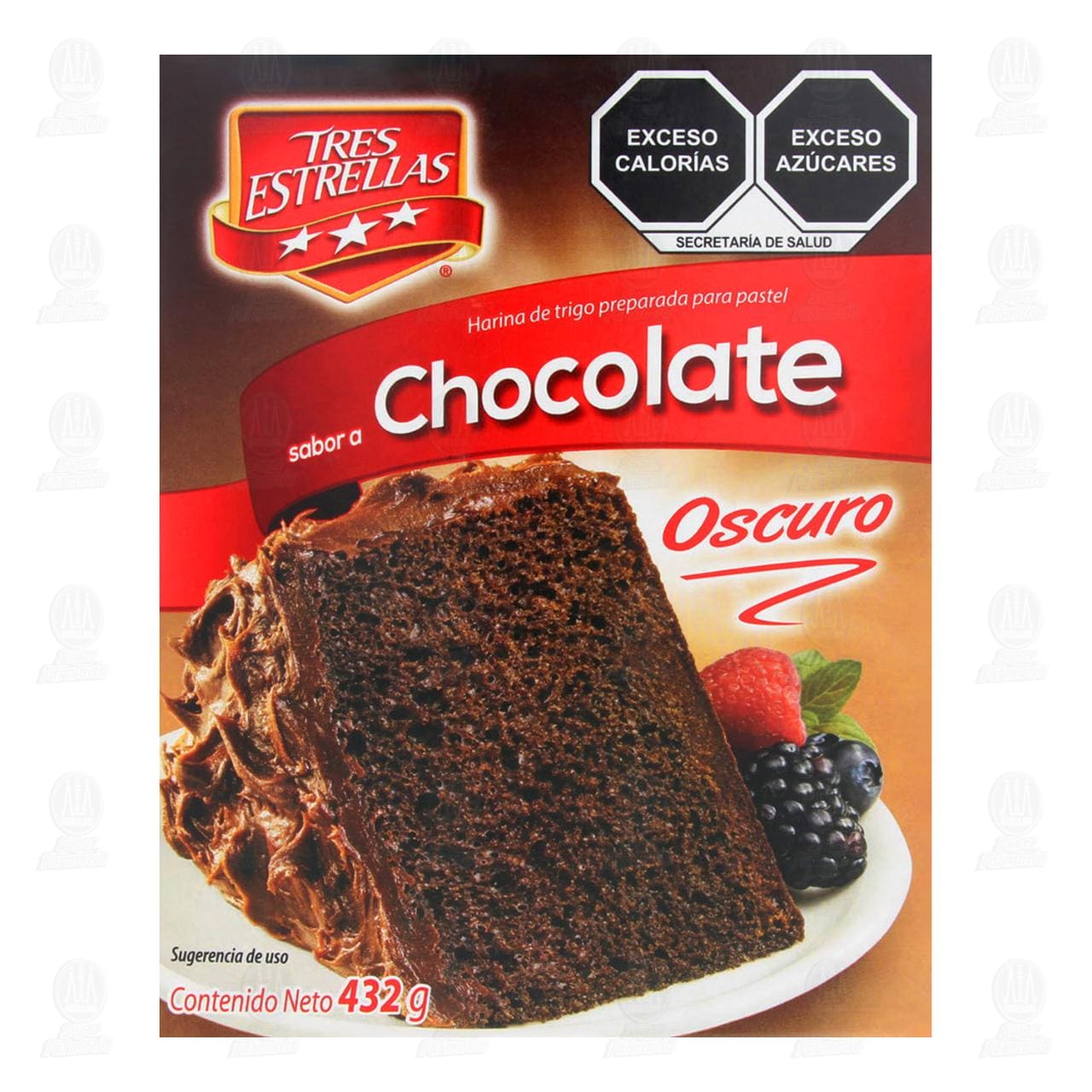 Harina de trigo preparada Tres Estrellas, para pastel sabor a chocolate oscuro. Caja con 432 gramos.