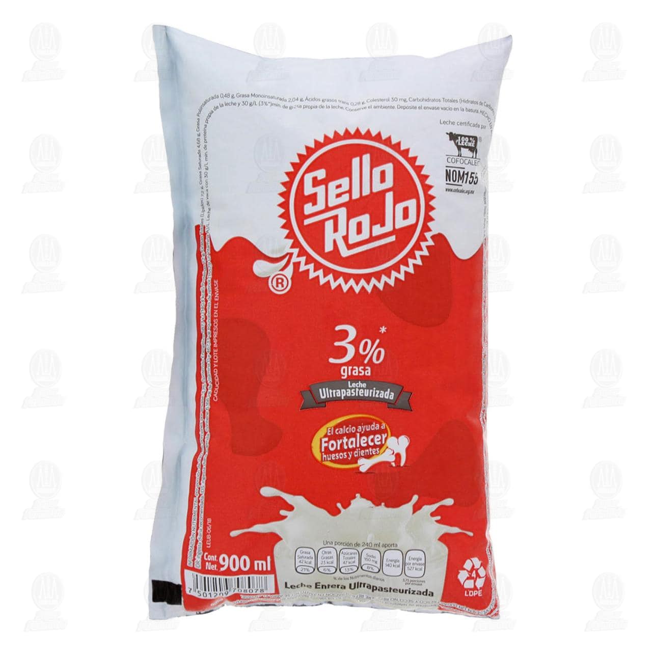 Leche Sello Rojo entera ultrapasteurizada adicionada con vitaminas A y D, con 3% grasa. Bolsa con 900 mililitros.