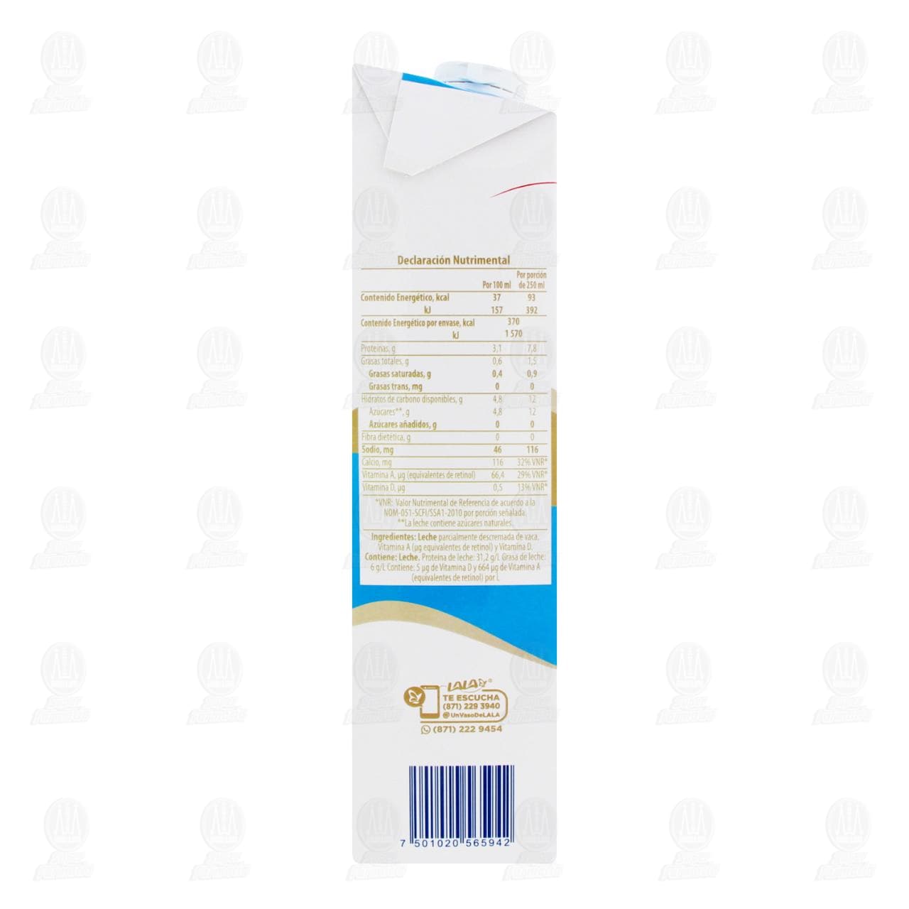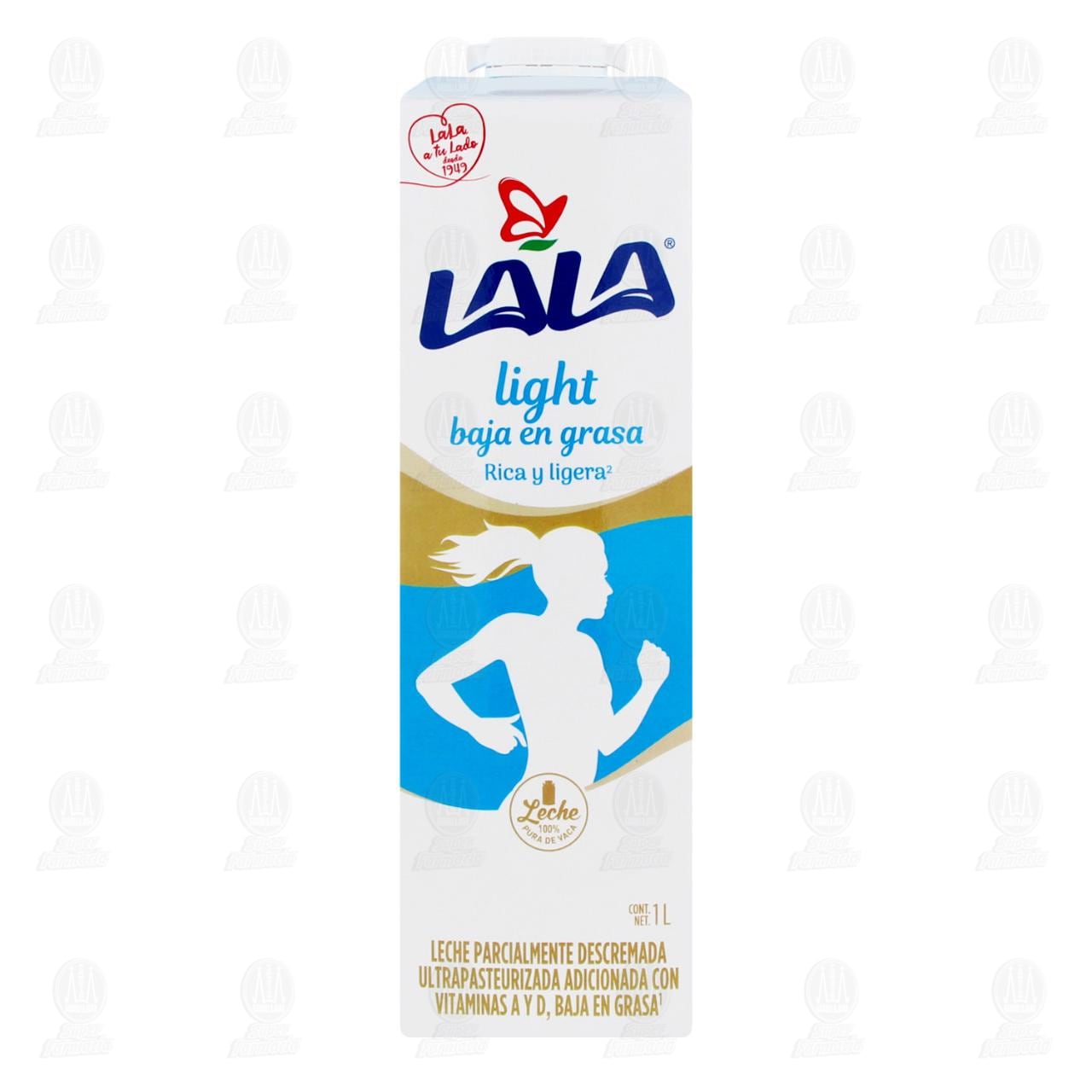 Leche Lala, parcialmente descremada, ultrapasteurizada, adicionada con vitaminas A y D, baja en grasa. Envase con 1 litro.