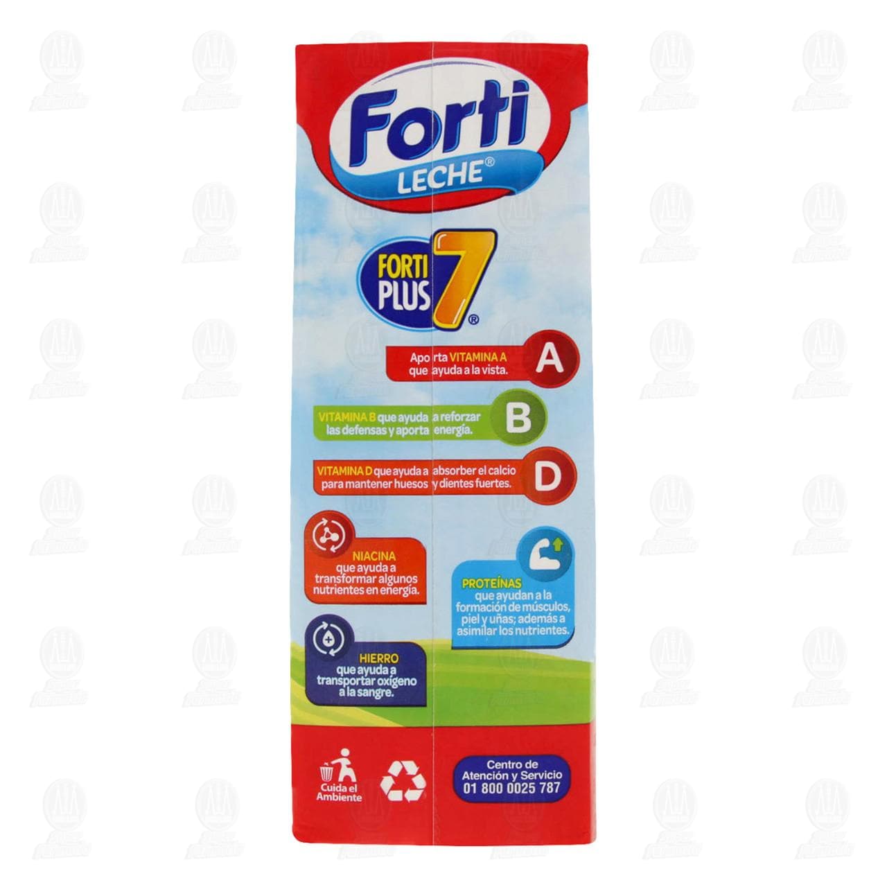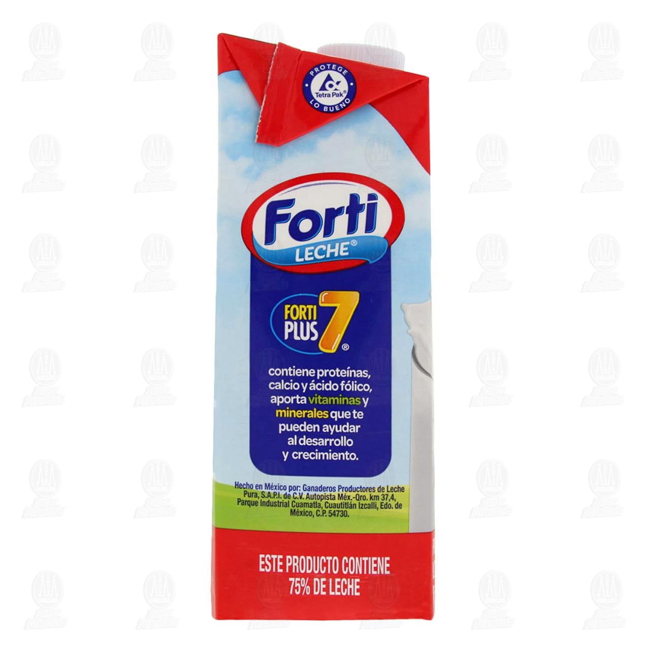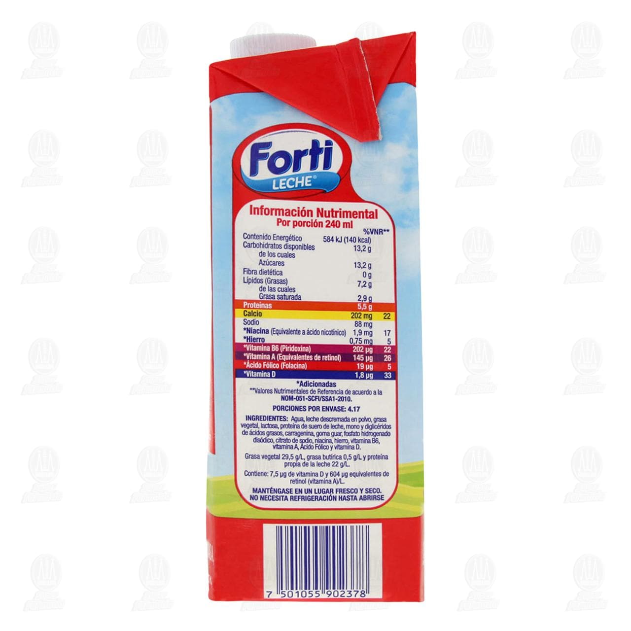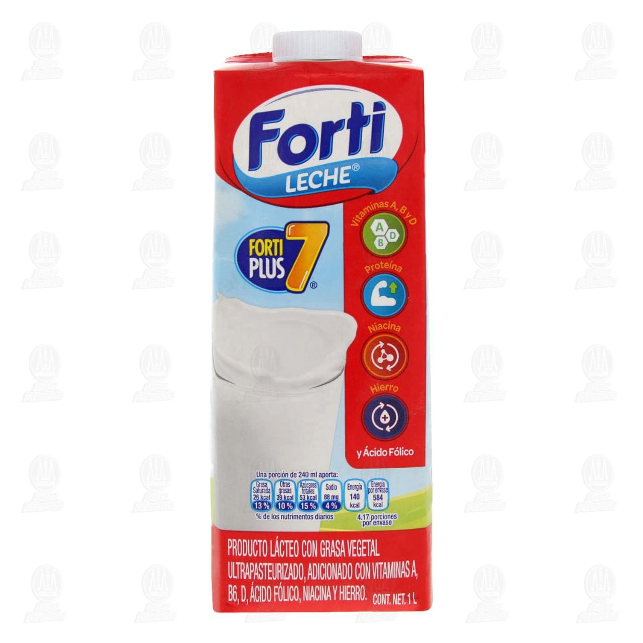 Producto lácteo FortiLeche con grasa vegetal ultrapasteurizado, adicionado con vitaminas A, B6, D, ácido fólico, niacina y hierro. Envase con 1 litro.