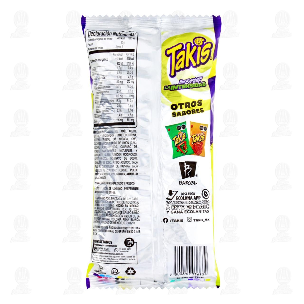 Botana Barcel Takis sabor chile y limón, perfecta para disfrutar sola o acompañar tus reuniones. Contiene 80 gramos.
