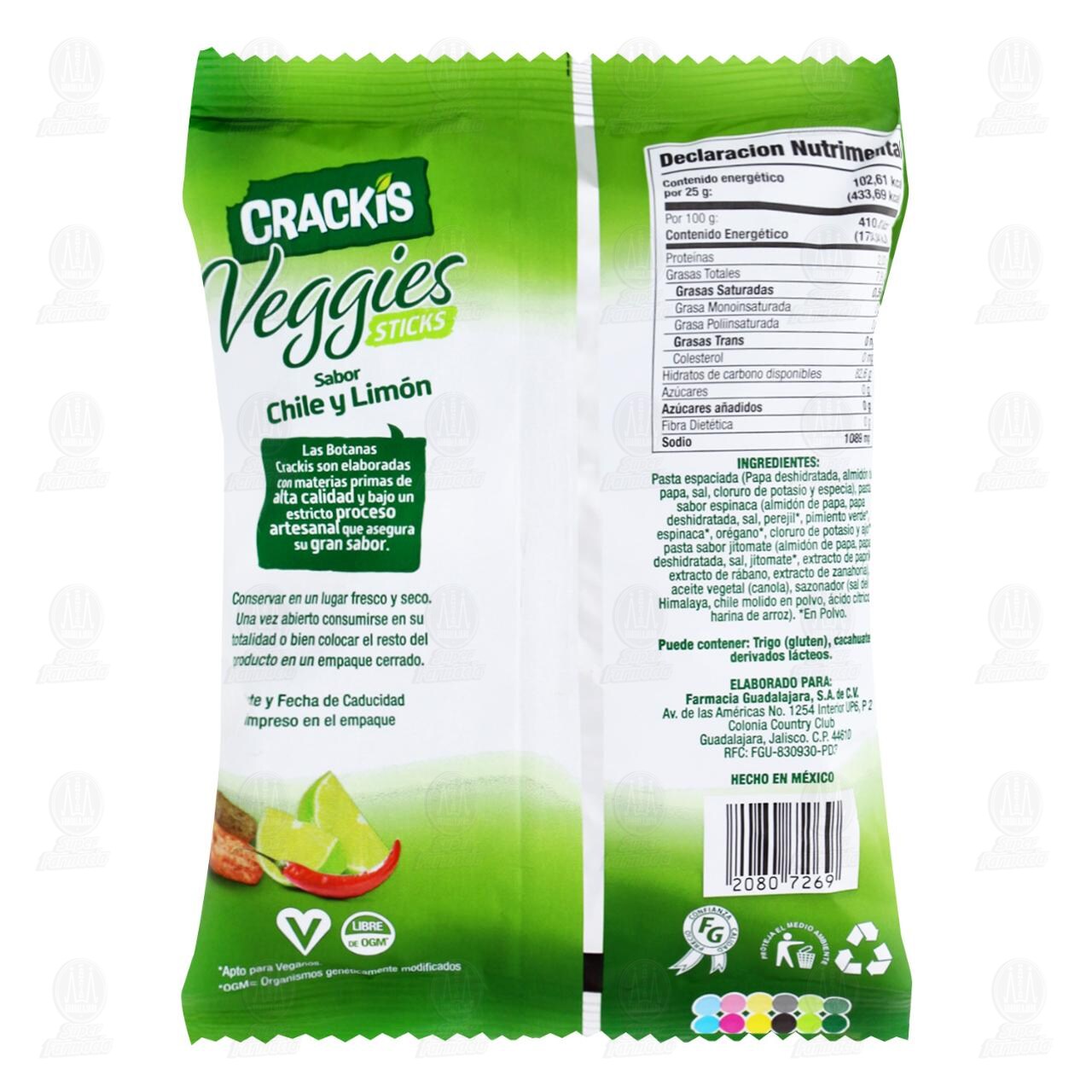 Botana Crackis Veggies Sticks a Base de Papa y Vegetales Sabor Chile y Limón. Bolsa con 25 gramos.