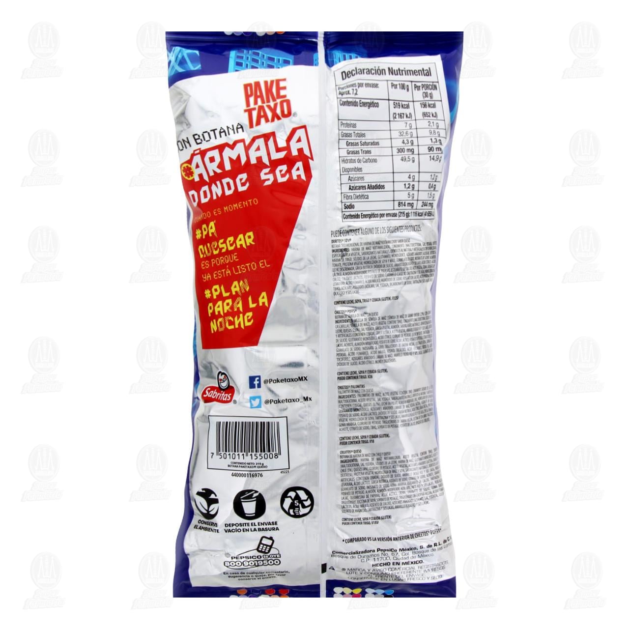 Botana surtida Paketaxo Quexo, con Doritos 3D's, Cheetos Poffets, Crujitos Queso y Cheetos Palomitas. Bolsa con 215 gramos.