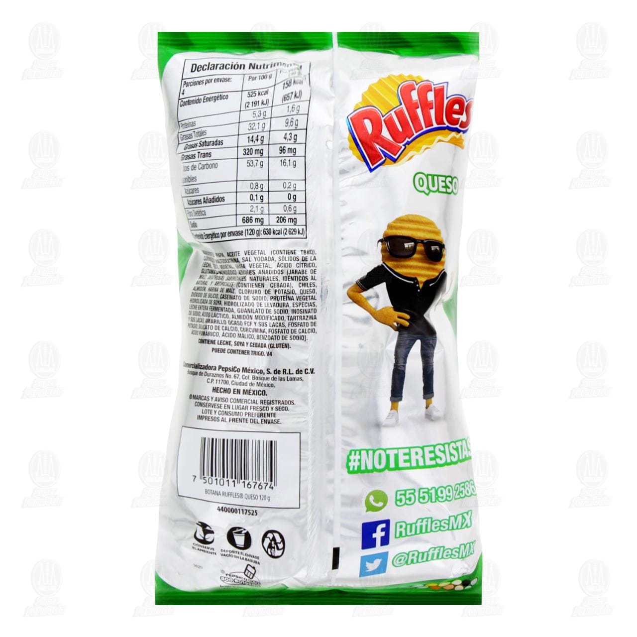 Botana Ruffles Queso, papas fritas onduladas sabor queso. Bolsa con 120 gramos.