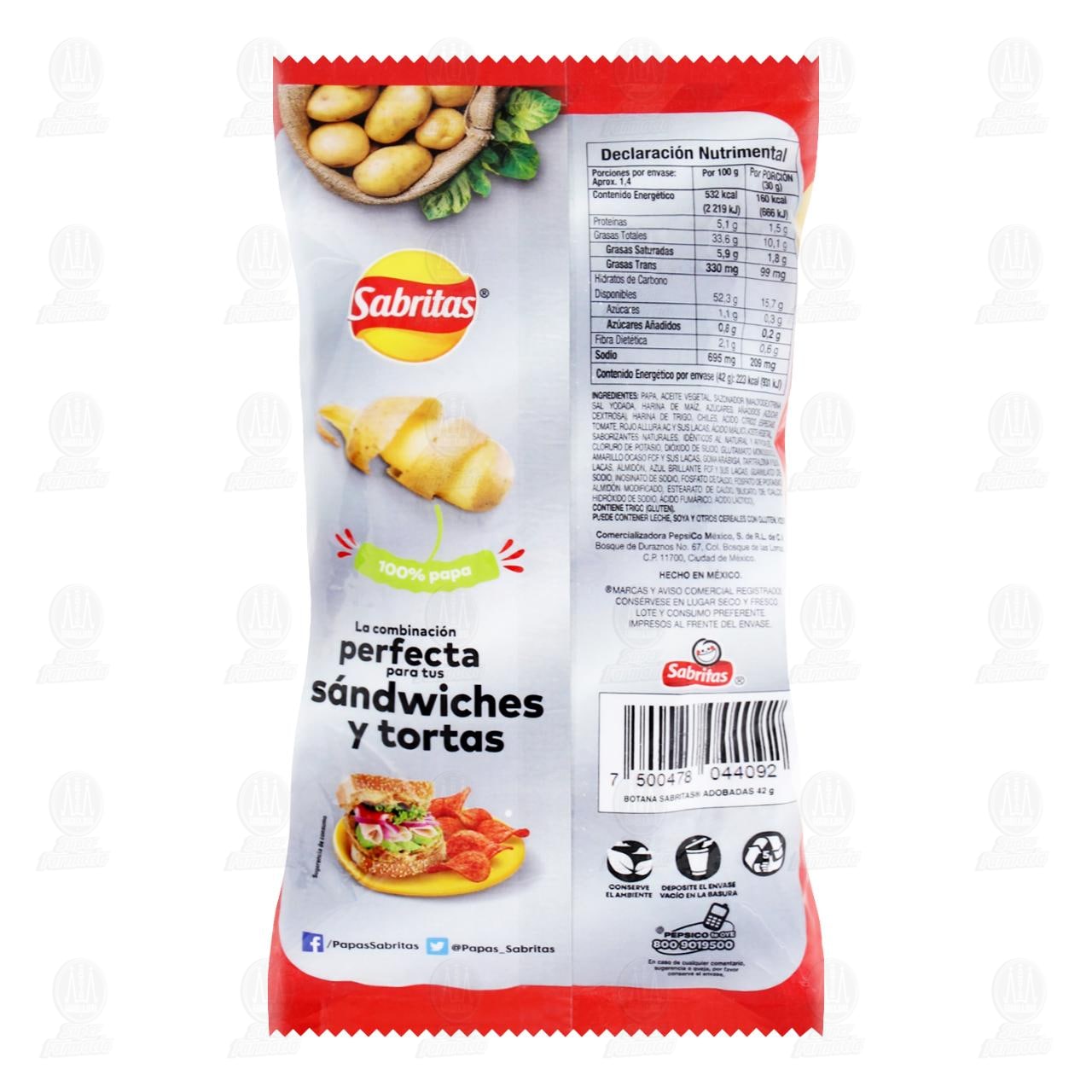 Papas Sabritas Adobadas, Fritas sabor adobo. Bolsa con 42 gramos.