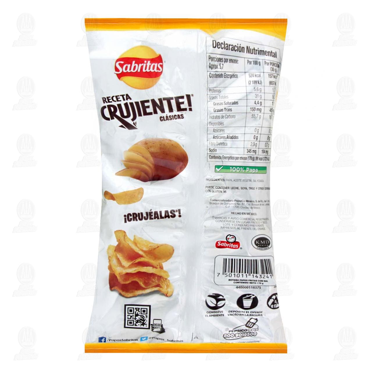 Botana Sabritas Receta Crujiente Clásicas, papas fritas con sal. Bolsa con 170 gramos.