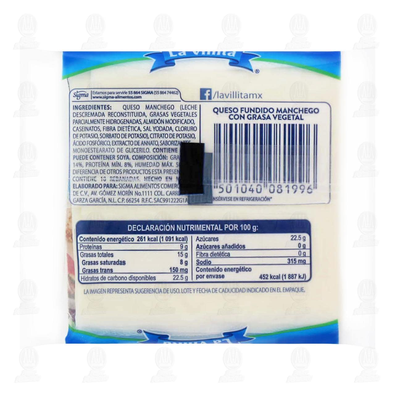 Queso manchego La Villita fundido, con grasa vegetal. Contiene 173 gramos con 10 rebanadas.