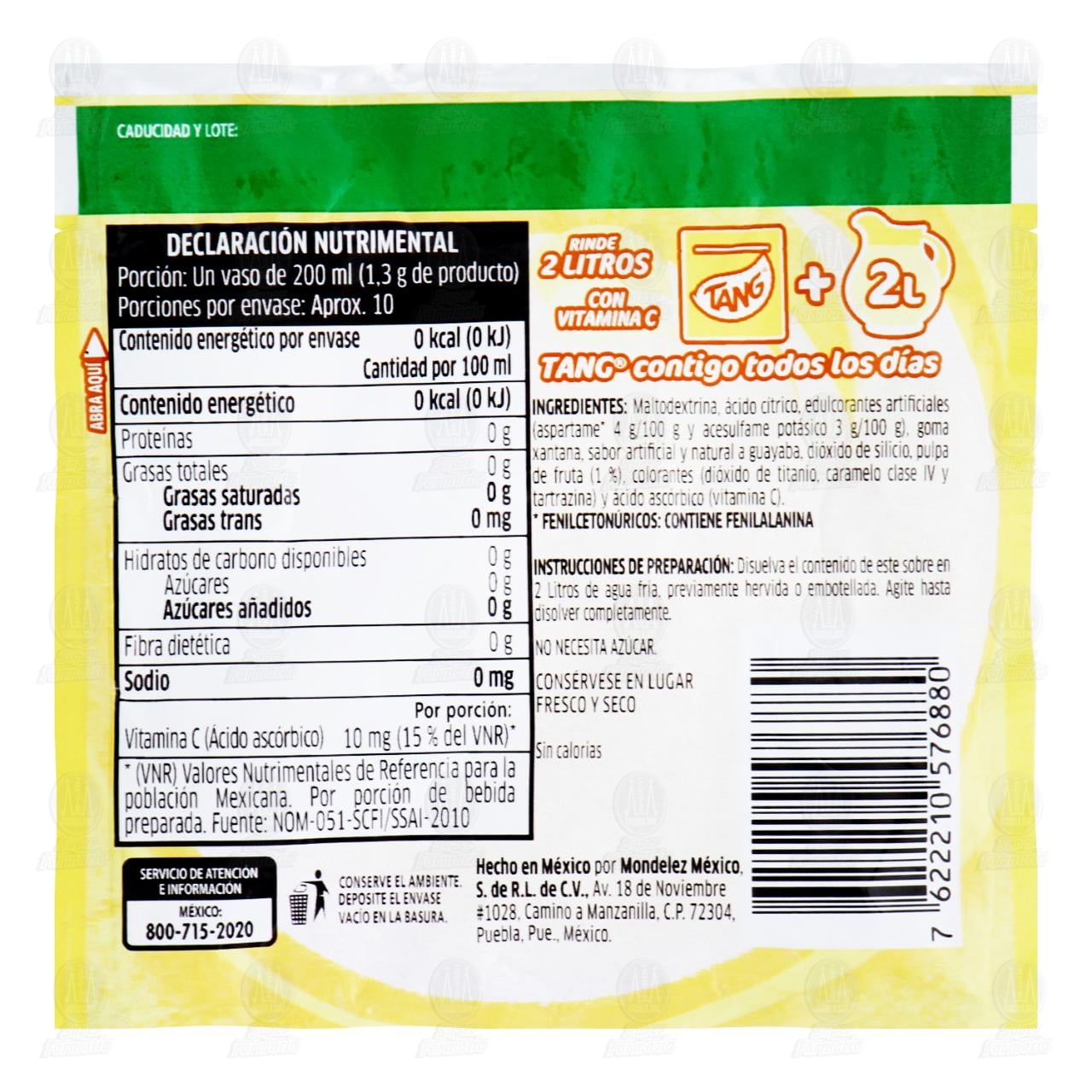 Polvo para preparar Bebida Tang sin azúcares sabor a guayaba, Adicionado con vitamina C. Sobre con 13 gramos.