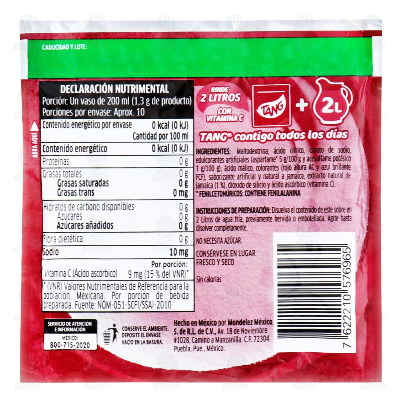 Polvo para preparar Bebida Tang sin azúcares sabor a jamaica, Adicionado con vitamina C. Sobre con 13 gramos.