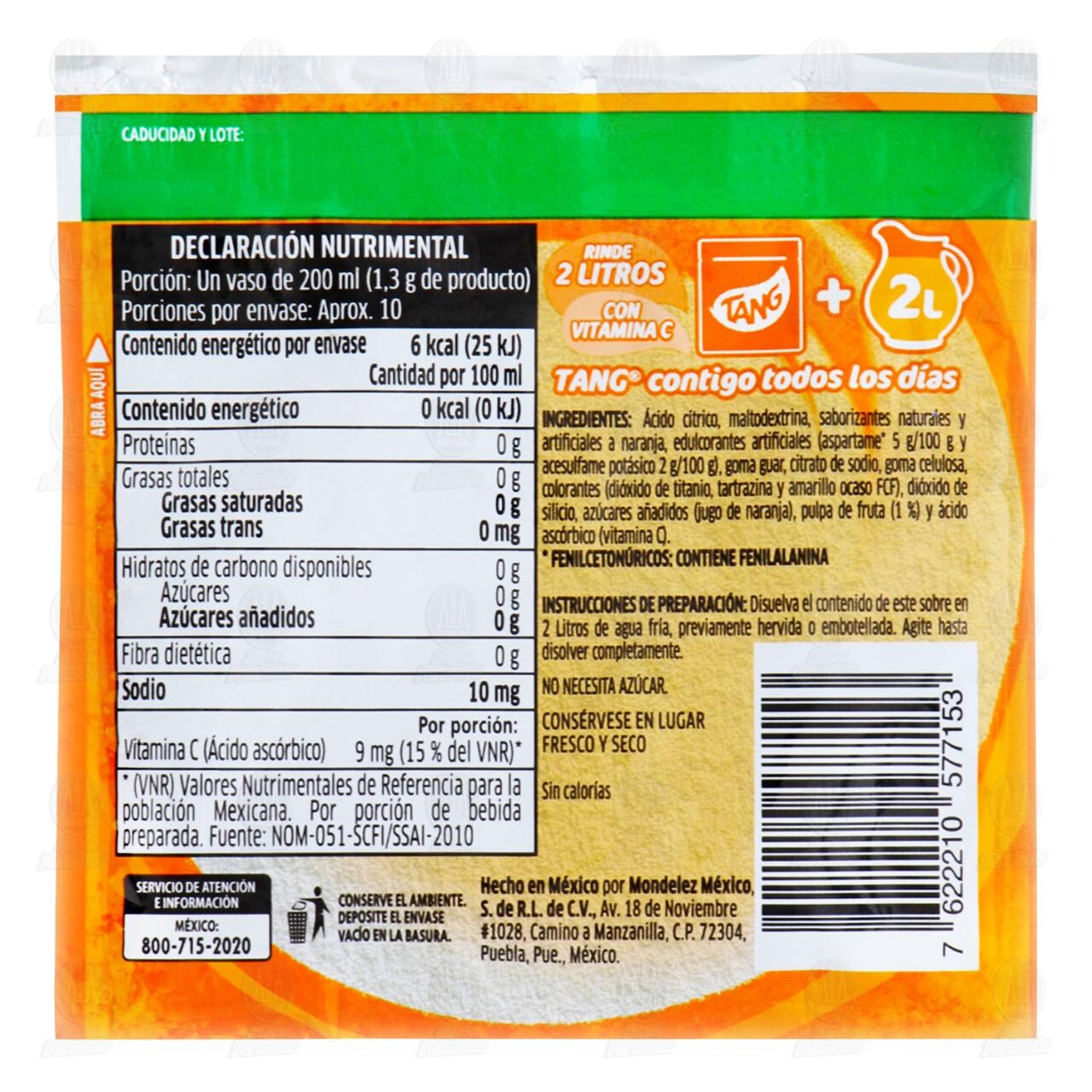 Polvo para preparar Bebida Tang sin azúcares sabor a naranja, adicionado con vitamina C. Sobre con 13 gramos.