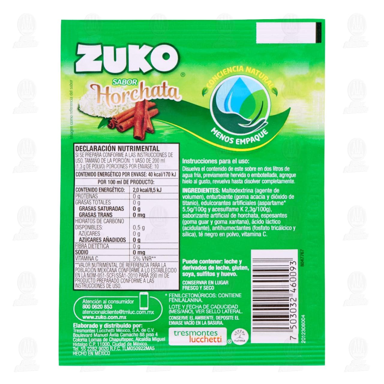 Saborizante en polvo Zuko para preparar bebida sabor horchata, adicionado con vitamina C. Sobre con 13 gramos.