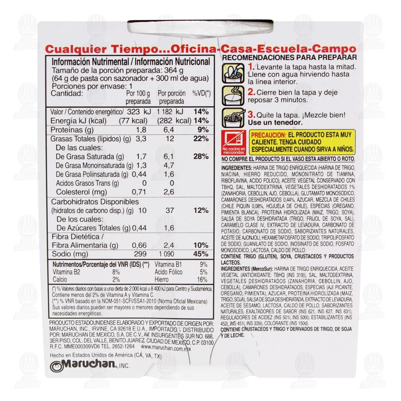 Pasta Maruchan Instant Lunch de harina de trigo precocida, con camarón y chile piquín. Contiene 64 gramos.