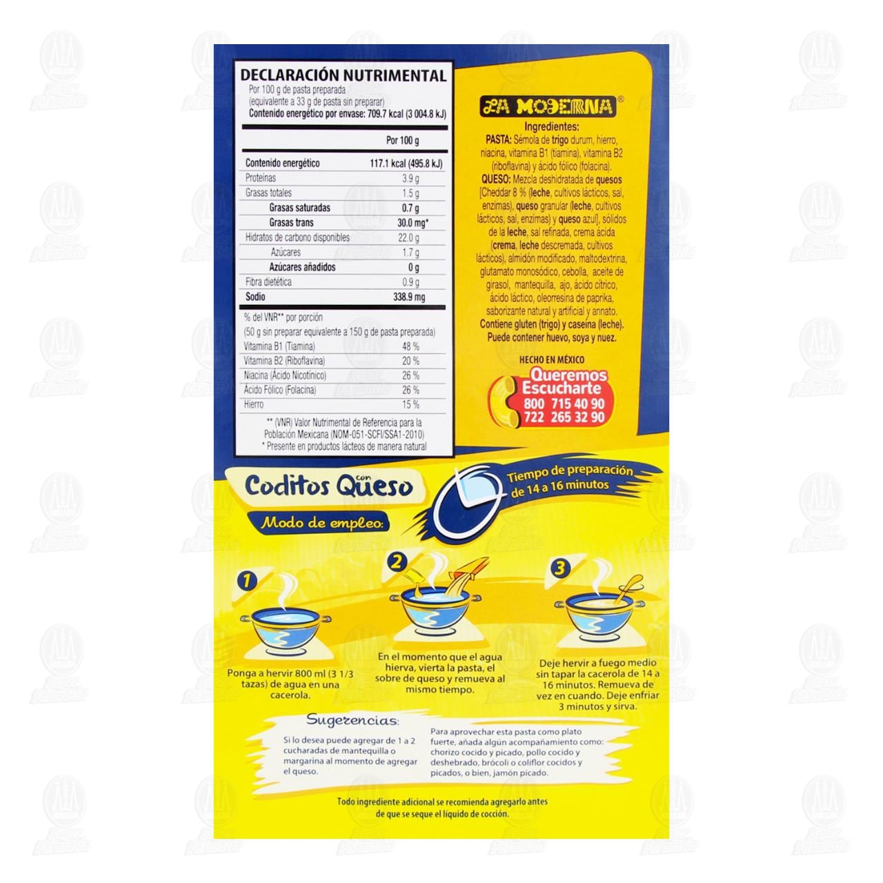 Sopa La Moderna, Pasta de Sémola de Trigo Durum para Preparar Coditos con Queso Chedar. Contiene 200 gramos.