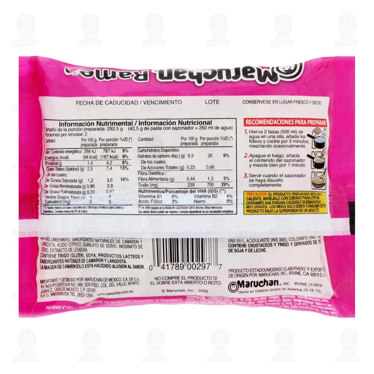 Contiene trigo (gluten), soya, productos lácteos y saborizantes naturales de camarón y langosta. El producto preparado está muy caliente. Manéjelo con cuidado para evitar derrames que puedan causarle quemaduras muy graves. Los niños solo deben consumir este producto bajo la supervisión de un adulto. Consérvese en lugar fresco y seco. Exceso de grasas saturadas.Detalles del producto