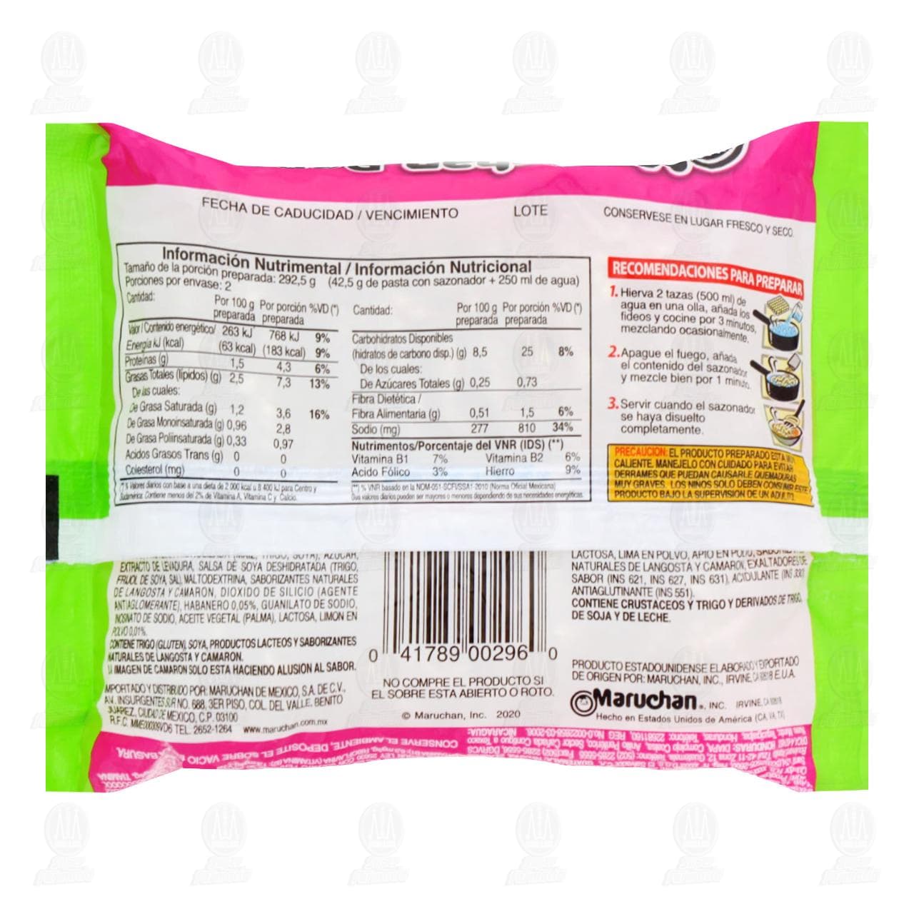 Sopa Maruchan Ramen de harina de trigo para preparar sopa instantánea sabor a camarón, limón y habanero. Bolsa con 85 gr.