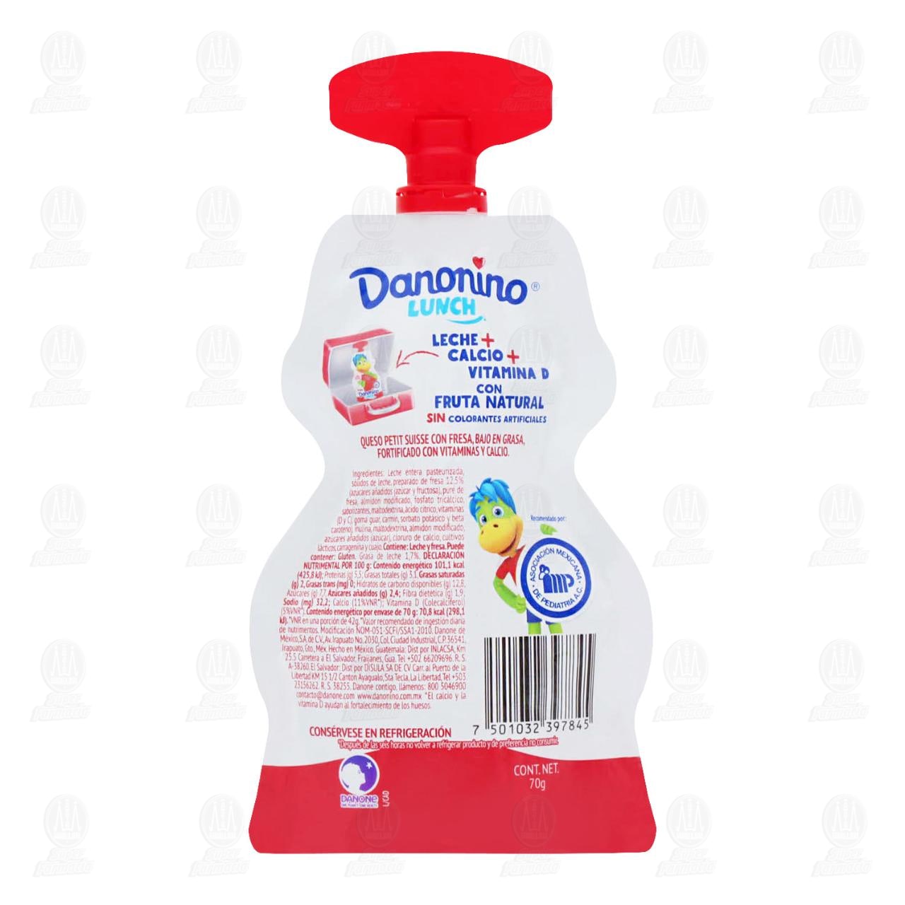 Queso petit suisse Danonino Lunch con fresa, bajo en grasa y fortificado con vitaminas y calcio. Contiene 70 gramos.