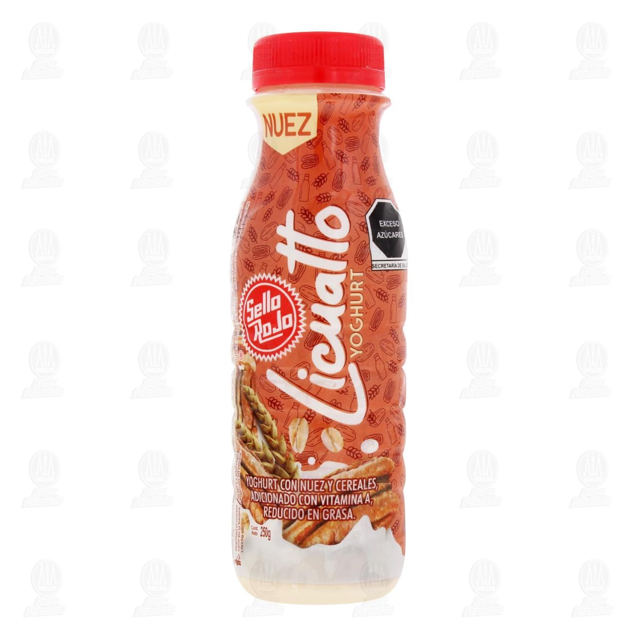 Yoghurt bebible Sello Rojo Licuatto, con nuez y cereales, adicionado con vitamina A, reducido en grasa. Envase con 250 gramos.