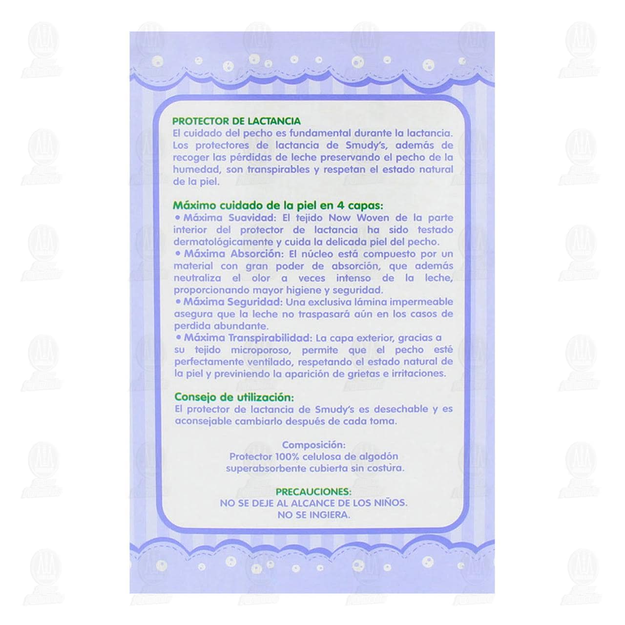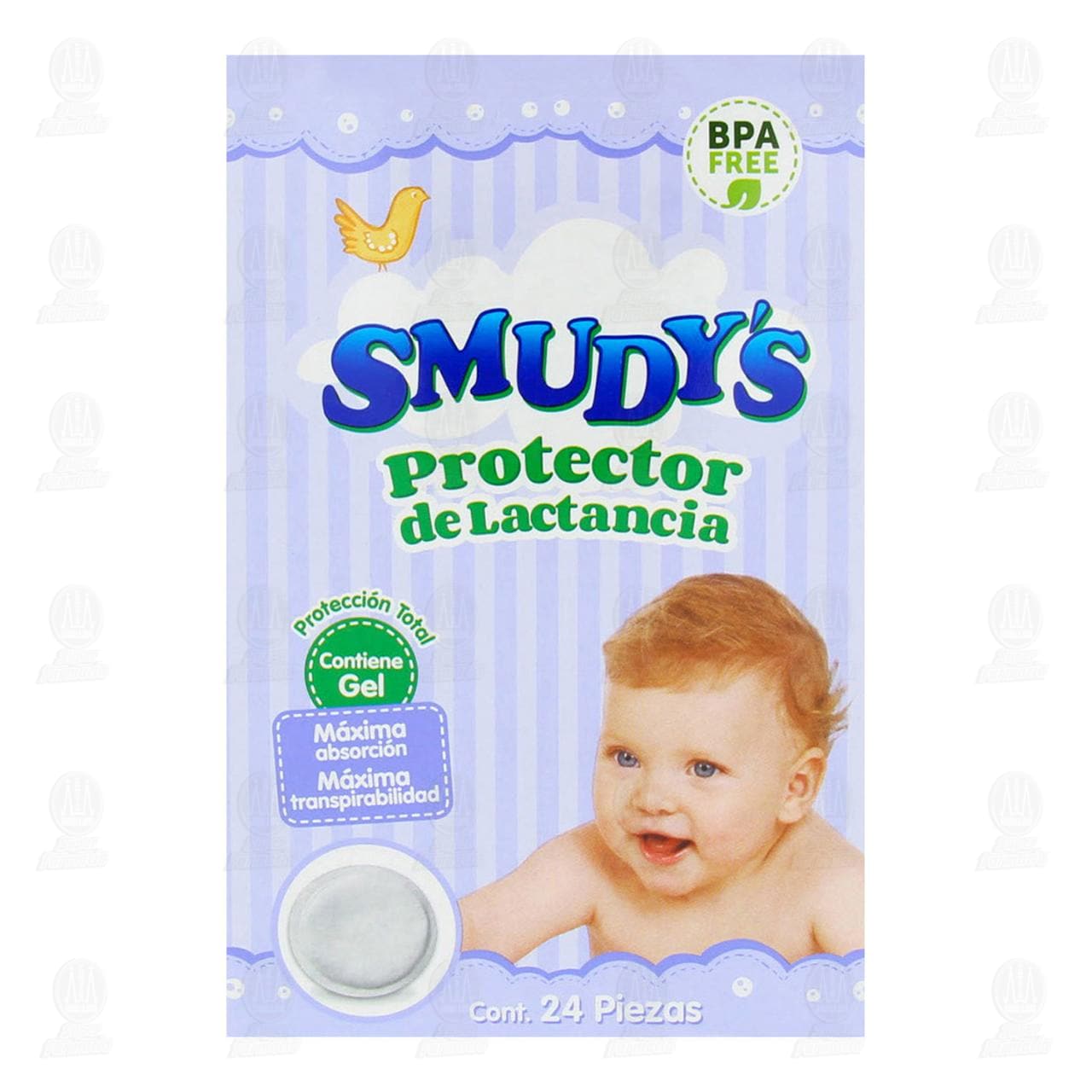 Protector de lactancia Smudy's desechables con protección total y gel de máxima absorción. Contiene 24 piezas.