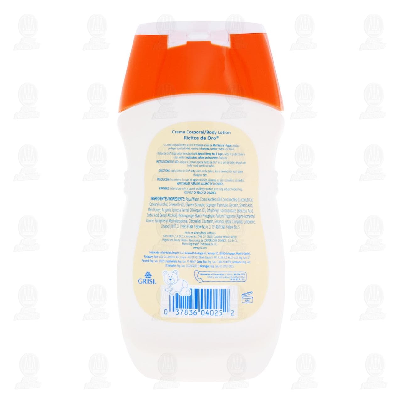 Crema Corporal Ricitos de Oro miel & argán de uso diario, Ayuda a proteger la piel del bebé mientras la humecta, suaviza y nutre. Contiene 250 mililitros.