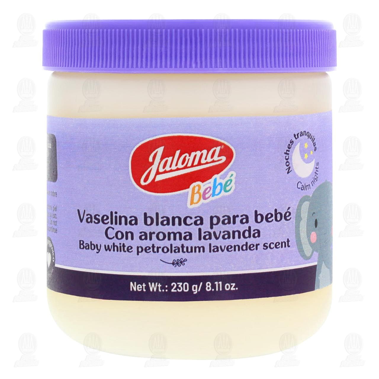 Vaselina blanca para bebé Jaloma, con aroma a lavanda, suaviza la delicada piel del bebé, protege de la humedad y ayuda a aliviar molestias causadas por raspaduras y quemaduras menores. Envase con 230 gramos.