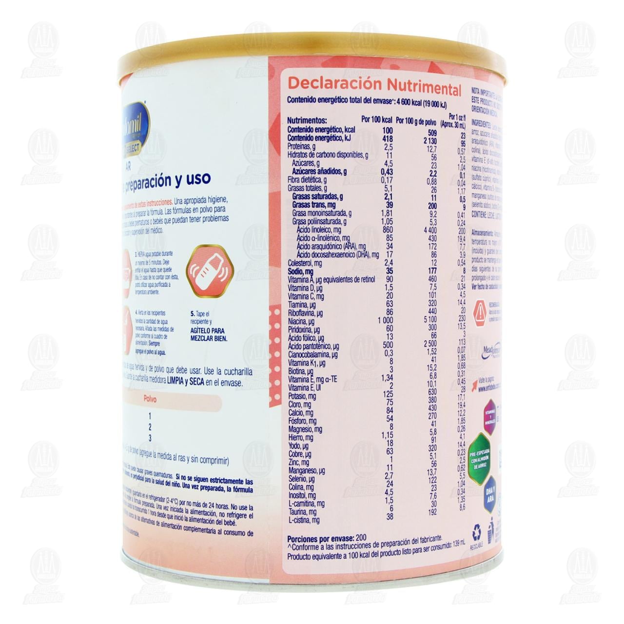 Almacene el envase sin abrir en un lugar fresco y seco (a temperatura no mayor a 30°C). Una vez abierto cúbralo con la tapa de plástico (incluida) y guárdelo bien cerrado en un lugar fresco y seco para asegurar que el producto se mantenga en buen estado. Utilice el contenido del envase dentro de los 30 días siguientes de su apertura. No congele el polvo, evite el almacenamiento prolongado y el calor excesivo. Advertencia: No use horno de microondas para calentar la fórmula. Esto puede causar grandes quemaduras. Si no se siguen estrictamente las indicaciones de preparación e higiene, éste o cualquier otro alimento, es perjudicial para la salud del niño. Una vez preparada, la fórmula puede echarse a perder rápidamente. Usted puede alimentar a su bebé inmediatamente o puede tapar el recipiente y guardarlo en el refrigerador (2-4°C) por no más de 24 horas. No use la fórmula preparada si estuvo sin refrigerar por más de 2 horas. No congele la fórmula preparada. Una vez iniciada la alimentación, no refrigere el recipiente. Deseche el alimento que queda en el recipiente sin tomarse cuando ha trascurrido 1 hora desde que inició la alimentación del bebé. Consulte con su pediatra, profesional de la salud (médico o nutriólogo) acerca de las alternativas de alimentación complementaria al consumo de fórmula infantil a partir de los 6 meses de edad del lactante. Utilícese bajo supervisión médica. Nota importante: La leche materna es el mejor alimento para el bebé. Este producto no sustituye a la leche materna. Solo utilícelo bajo orientación médica.Detalles del producto