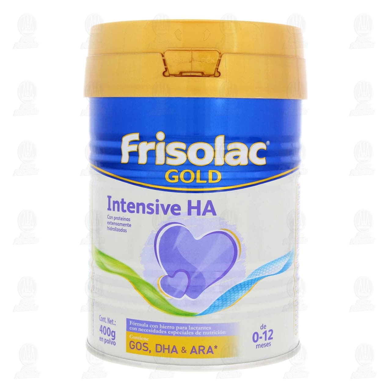 Fórmula infantil Frisolac Gold Intensive HA, indicada para lactantes de 0 a 12 meses con necesidades especiales de nutrición. Alimento en polvo adicionado con GOS, DHA, ARA, hierro y proteínas extensamente hidrolizadas. Lata con 400 gramos.